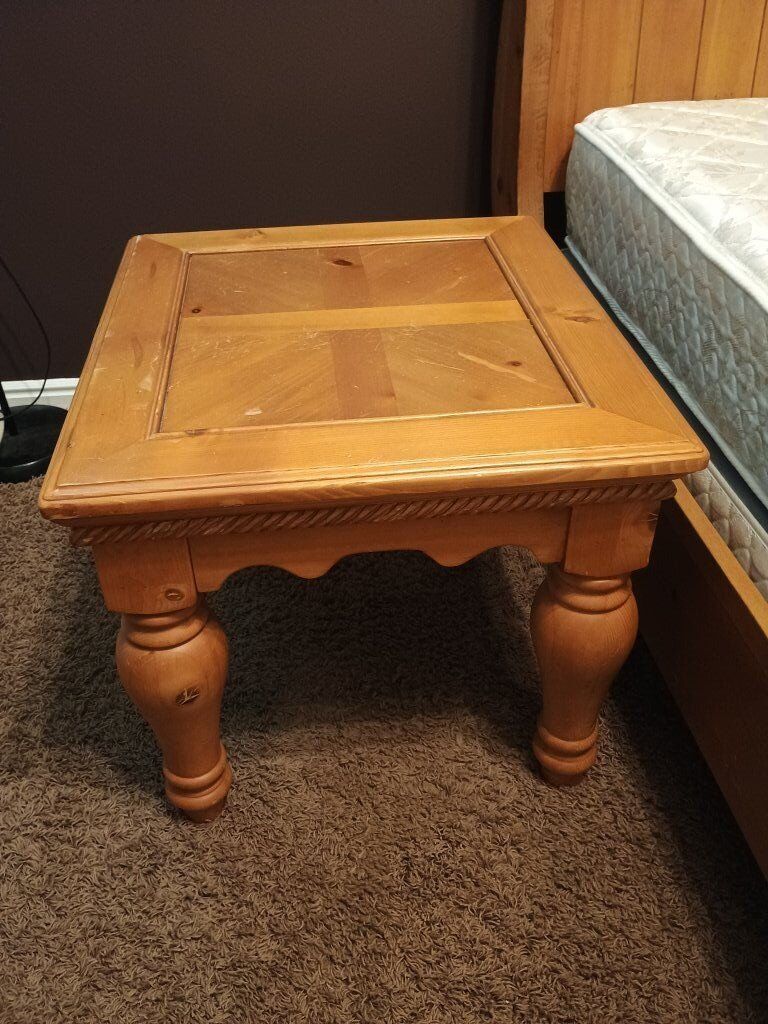 Queen sized bed with frame, box spring and mattress. include 2 side tables. Sturdy wood frame and tables. in good condition.