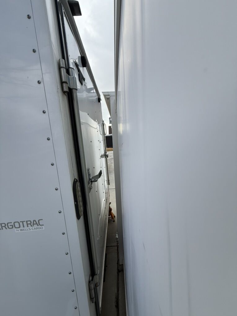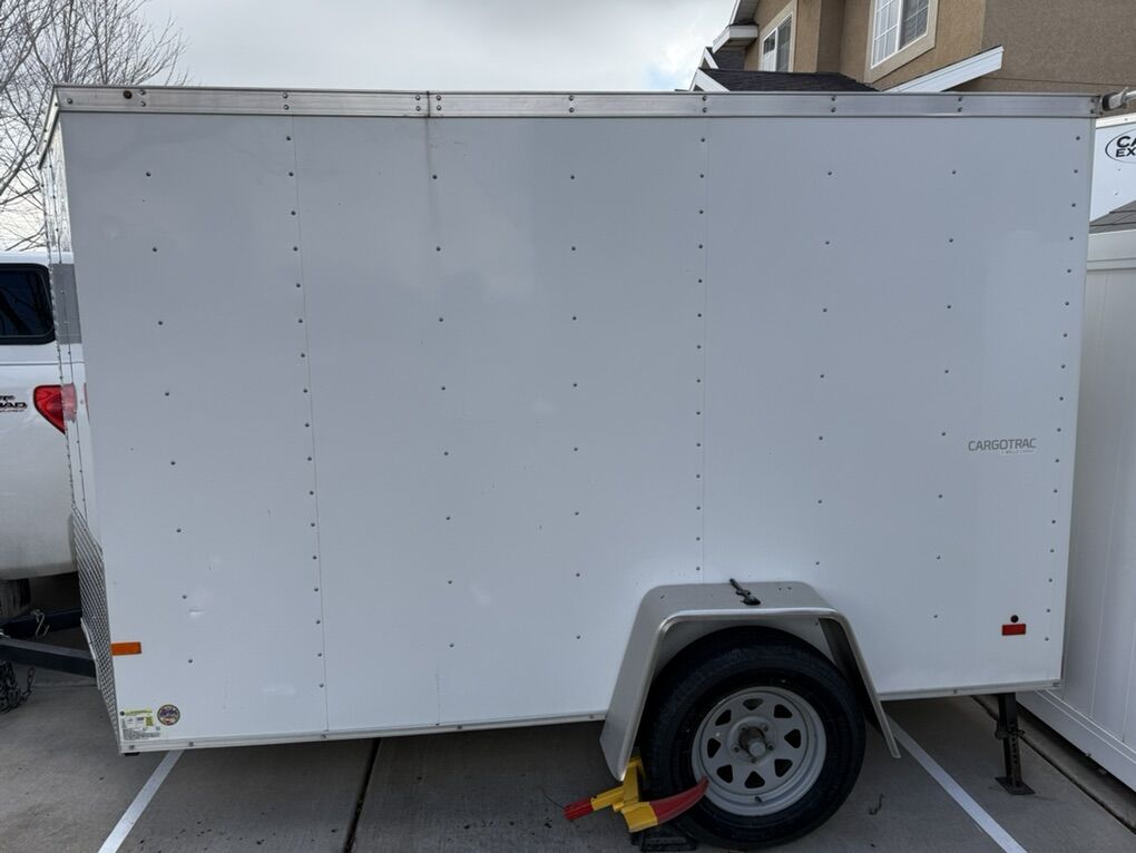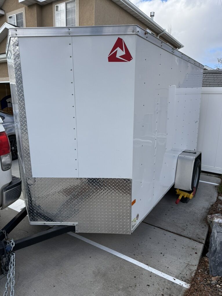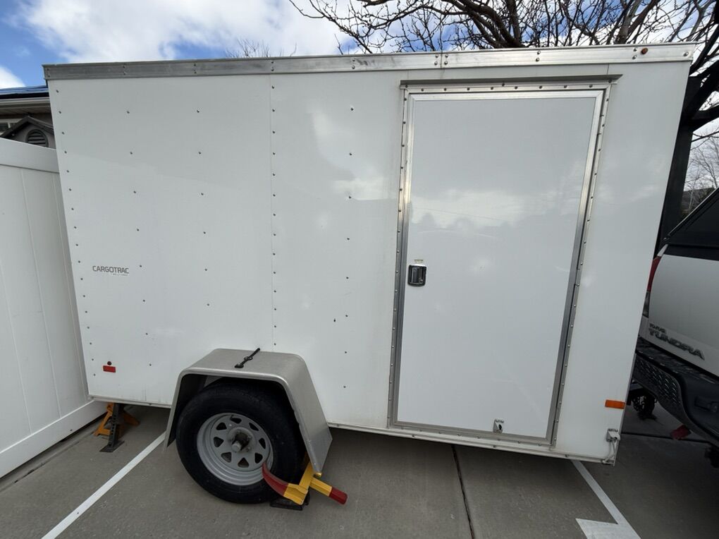For sale 6x10 enclosed v nose trailer in excellent condition Clean title in hand Tie down loops in corners of floor Interior light Roof vent Side door Rear ramp door 2” Ball Cabinet built in to nose for storage/organization Pulls very nicely Includes spare tire