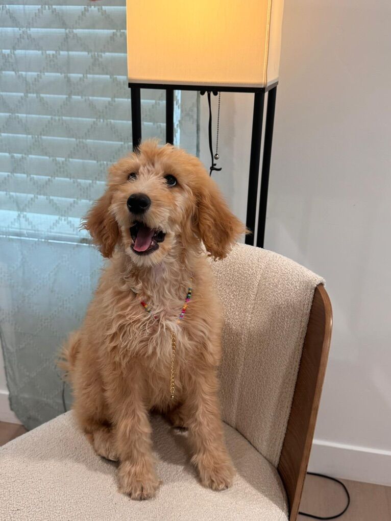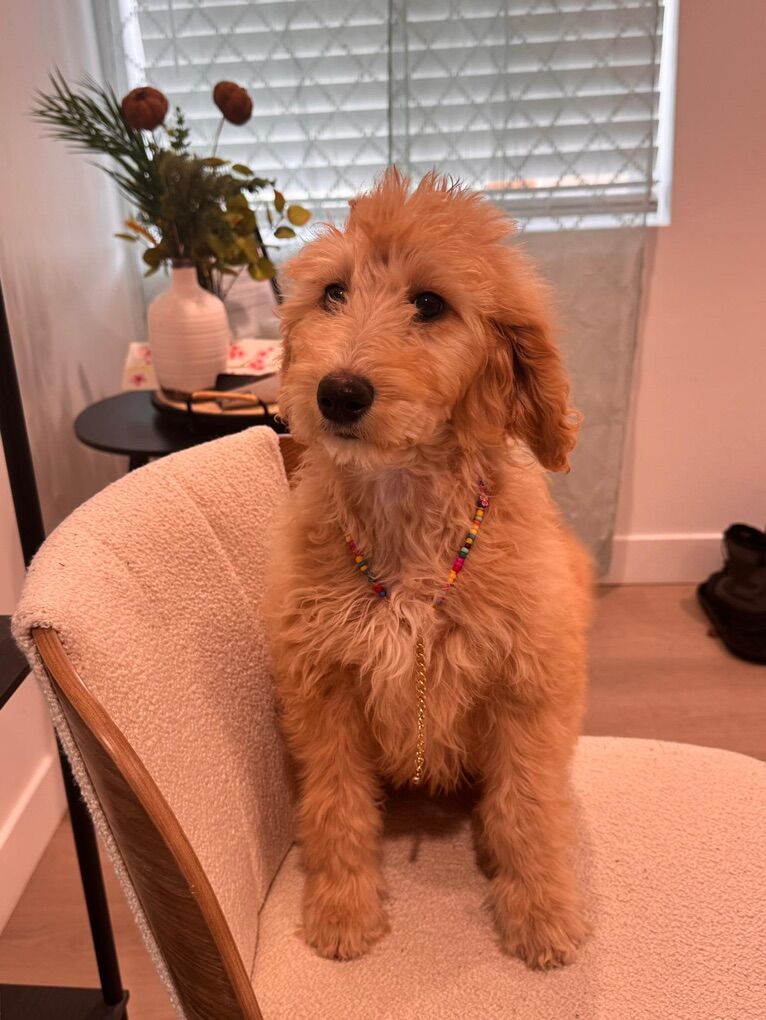 Age: 3–4 months Current weight: ~13 lbs Estimated size: small–medium (mini doodle type) Sex: Female Coat: Apricot, wavy/low-shedding
