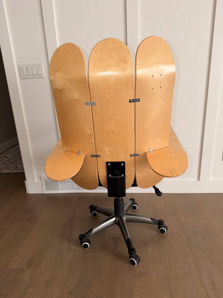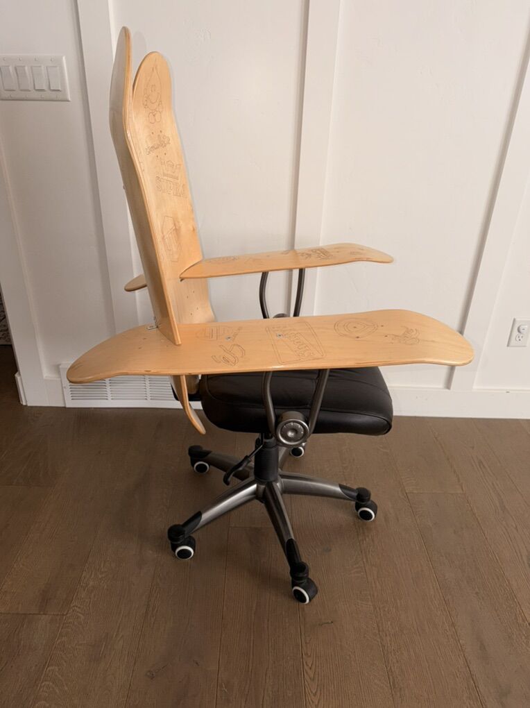 VenmoI made this Skateboard Chair about 15 years ago. All the boards are made of Bamboo. I burnt all the classic original skateboard brands into the decks from the 90’s. The width along the back is 14”, if you’re bigger in the waist you won’t fit comfortably. It’s fairly comfortable, I’ve got a bad back so I can’t use it anymore. It’s sturdy, it is missing (2) L brackets and some screws. If I have time before it sells I’ll go to Home Depot to get them, they will make it more solid.