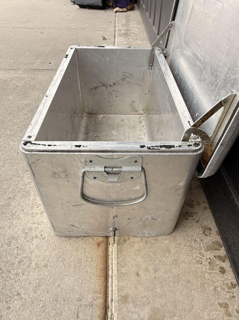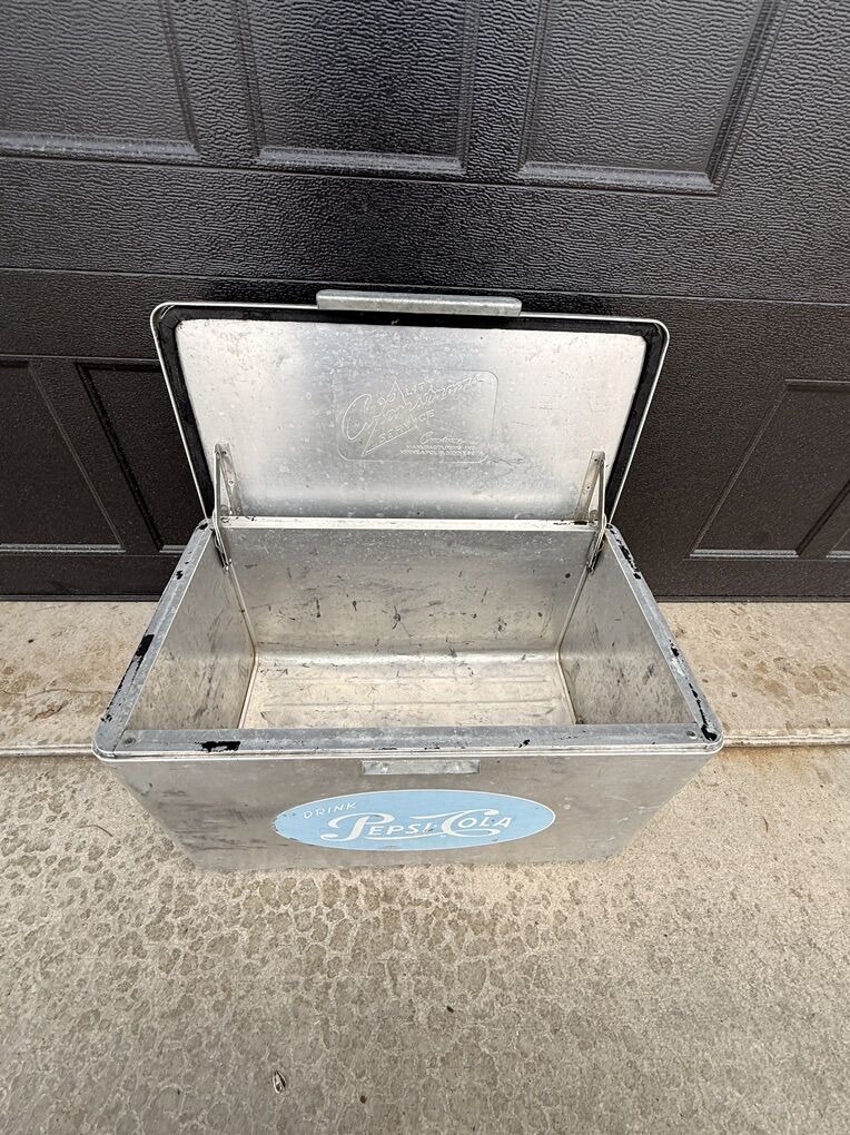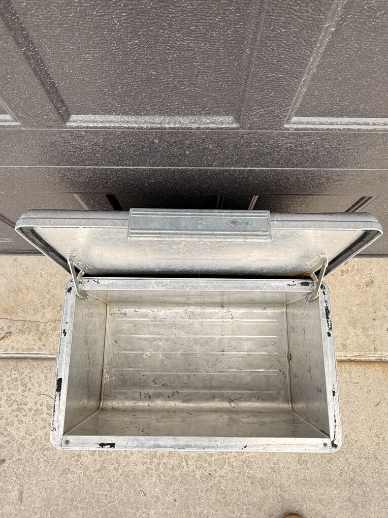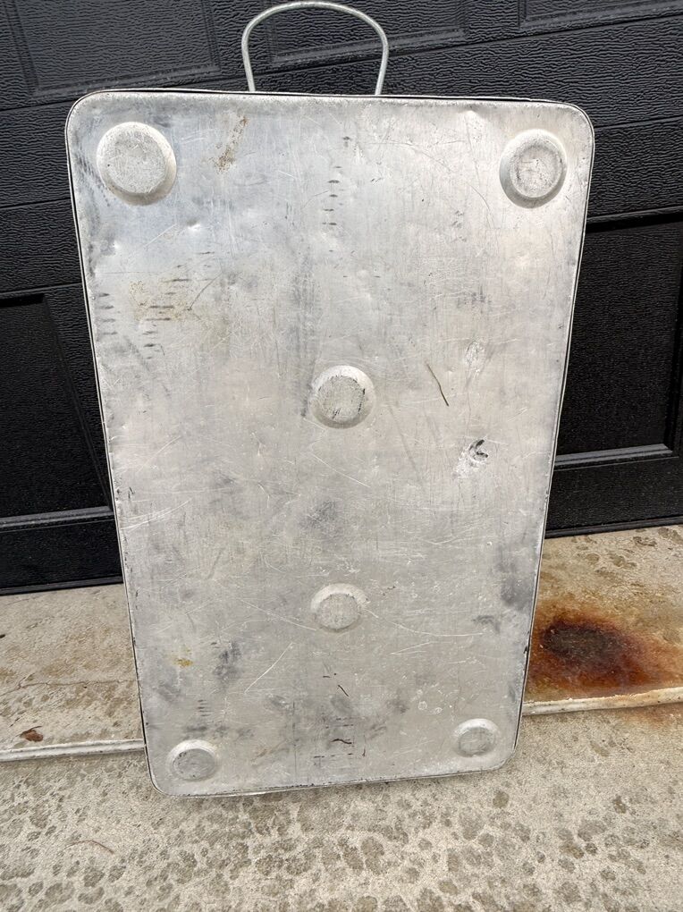No holes, some dents and dings here or there but that just adds to the character. Latch works. Handles are securely attached. Drain hole. Ready for your next bbq.