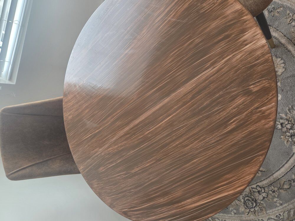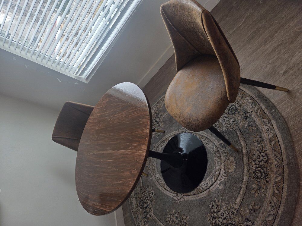Venmo31.5" table, redid the top to look like wood. 2 suede chairs. All in great condition! moving and they can't come. $150. You pick up.