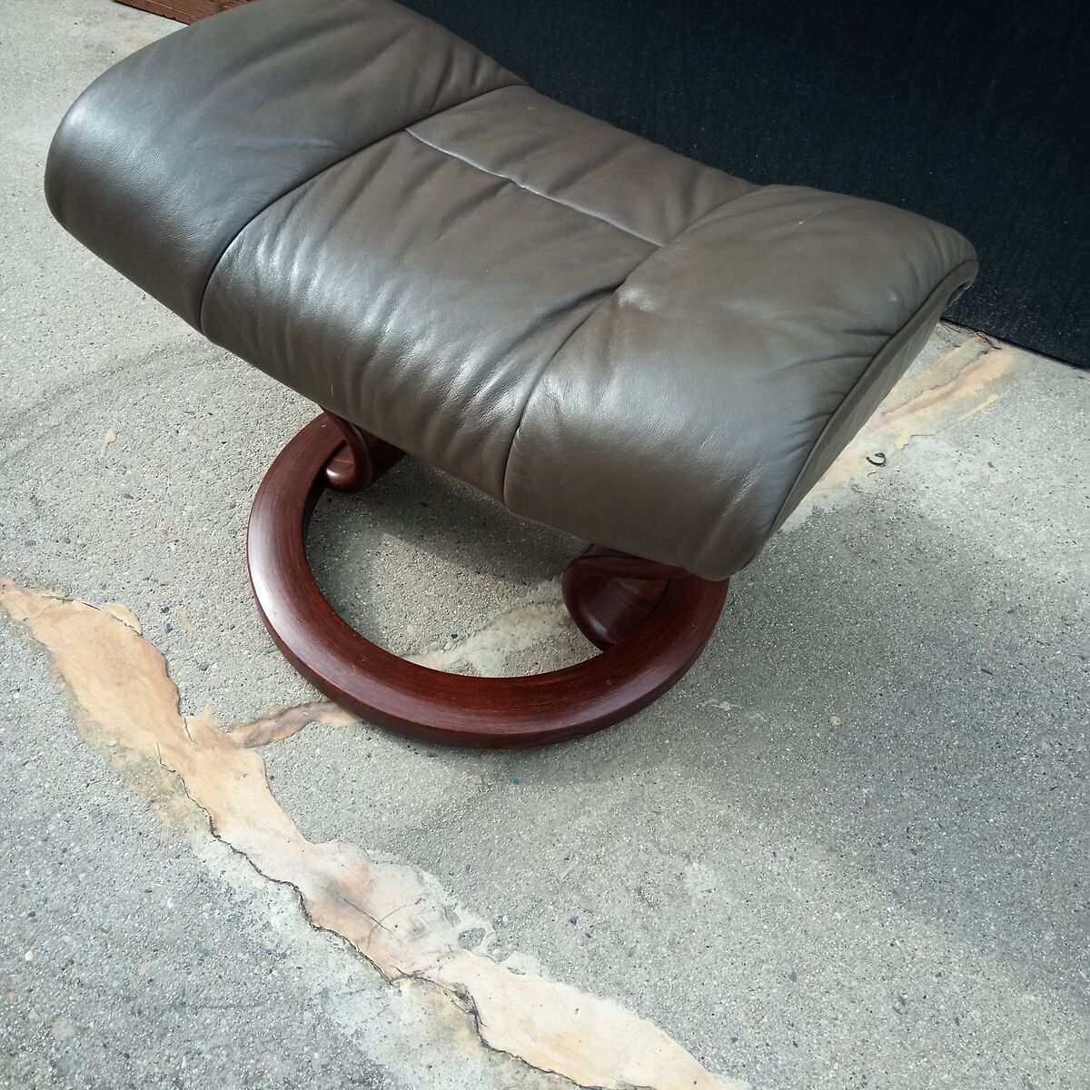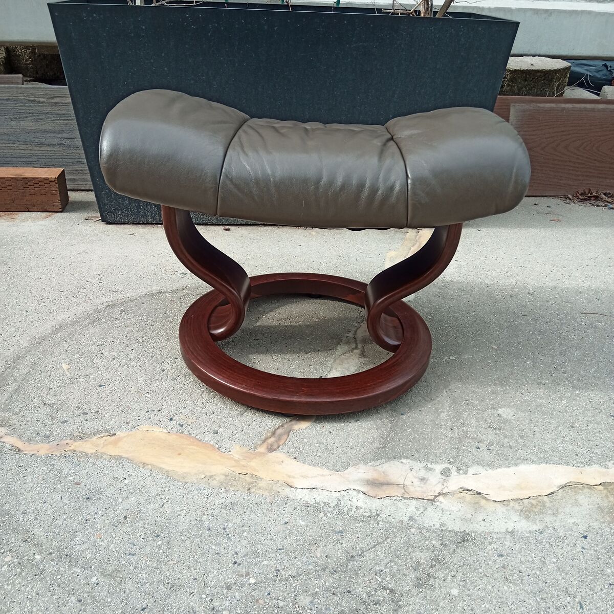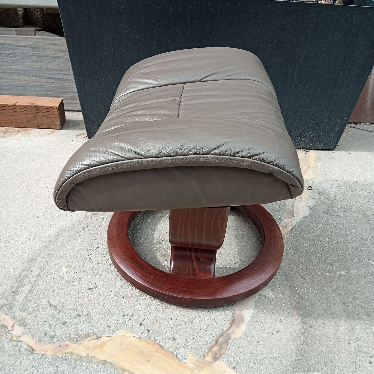 In a brown/grey leather with a darker wood frame. This is one of the more recent models so has the tilt mechanism. In good condition, no scratches to the wood nor the leather