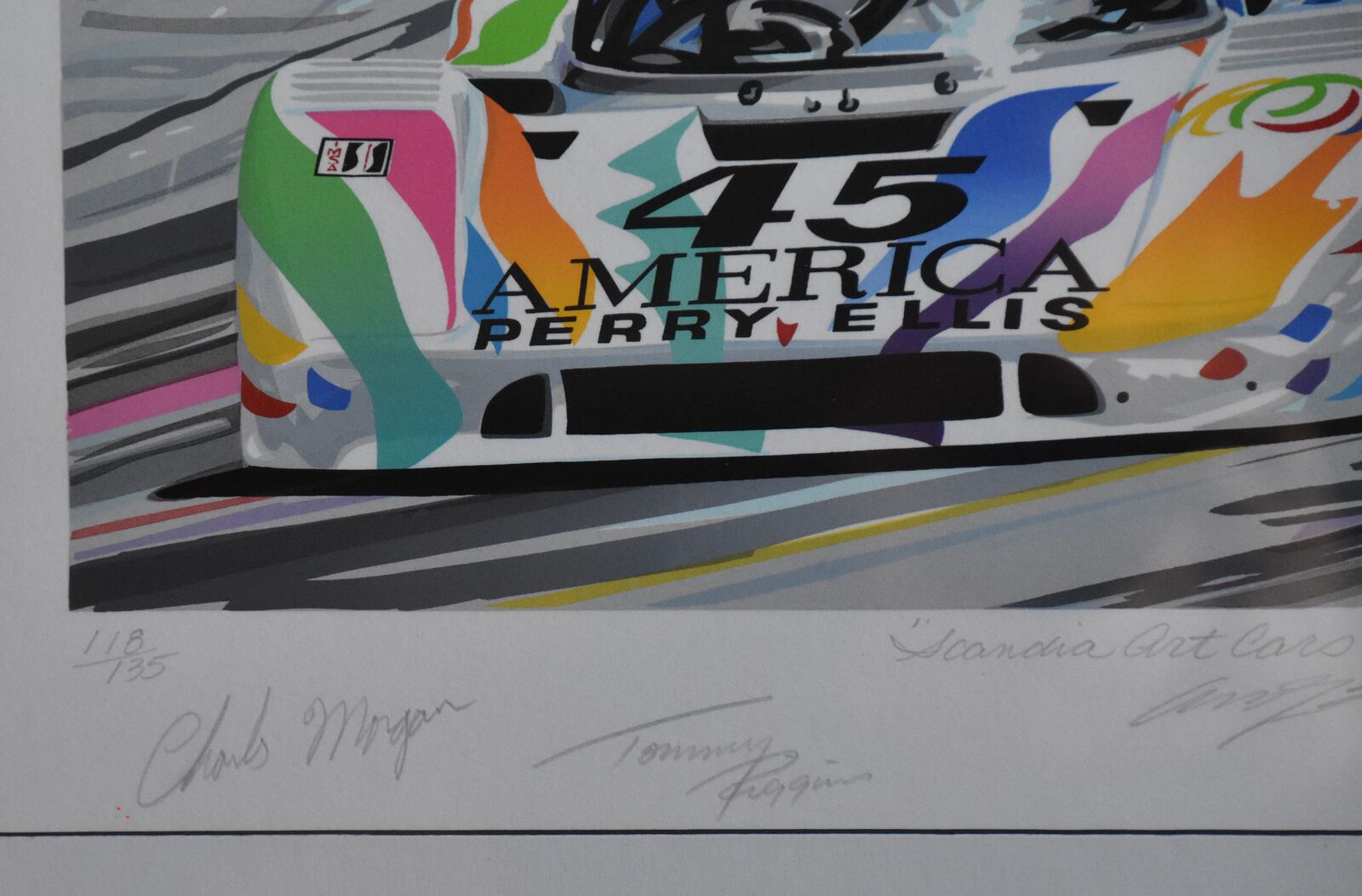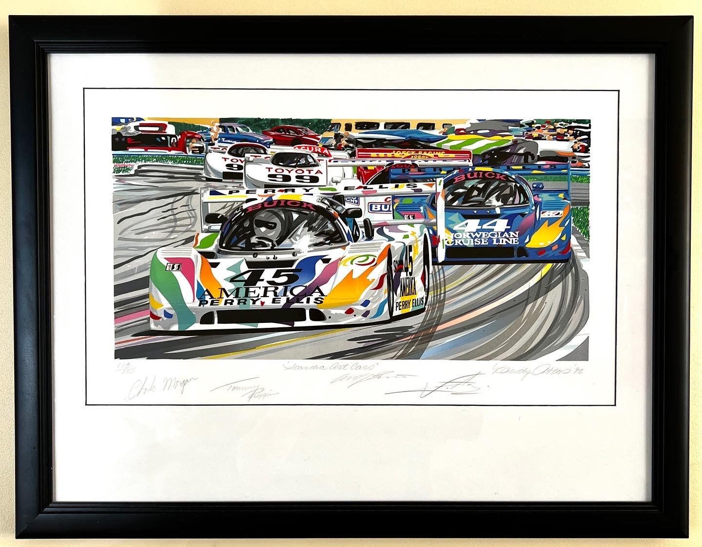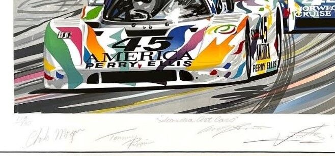 The IMSA Scandia Serigraph is autographed by drivers, Chip Moran, Andy Evans, Rolf Stromelen, Tommy Riggins,