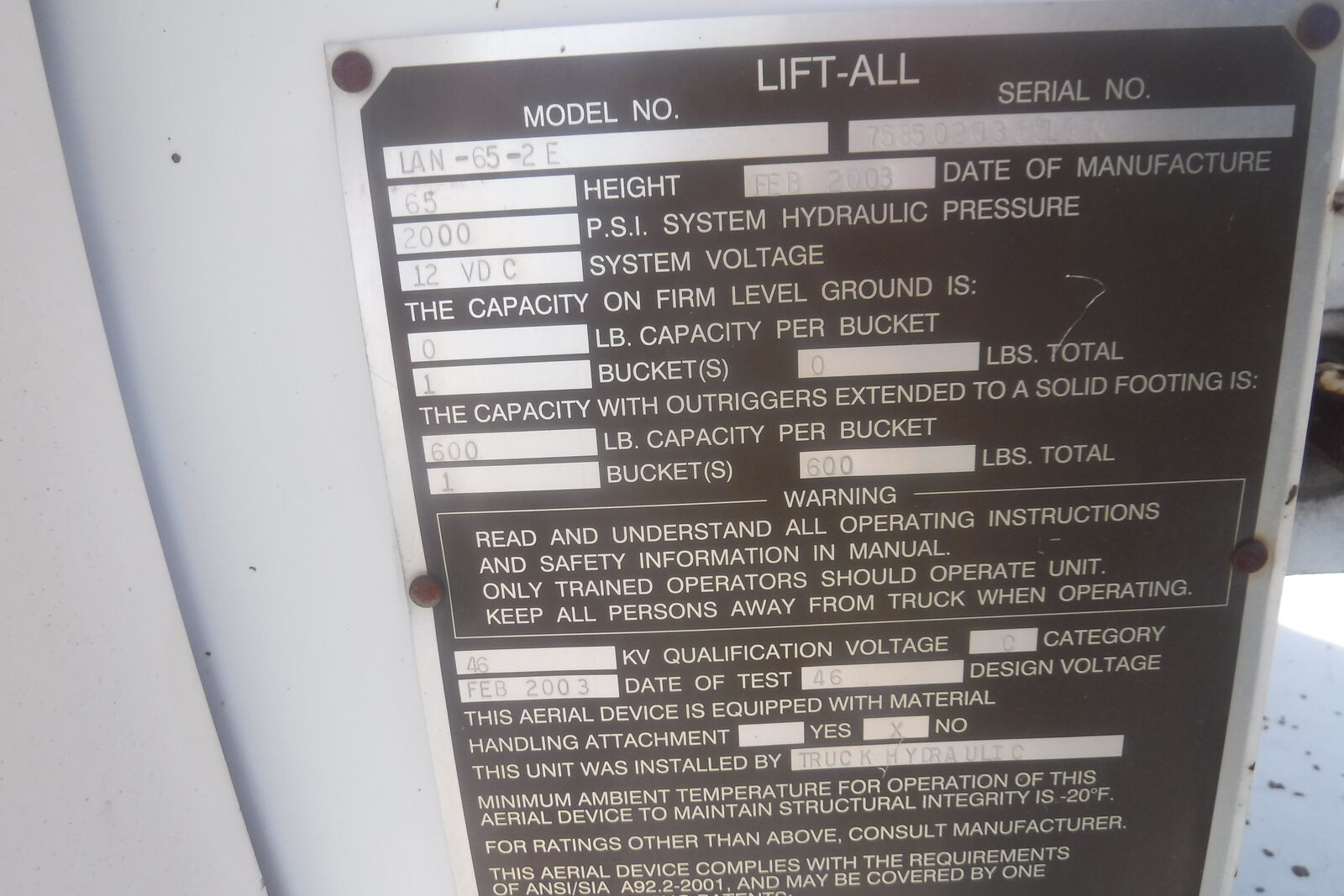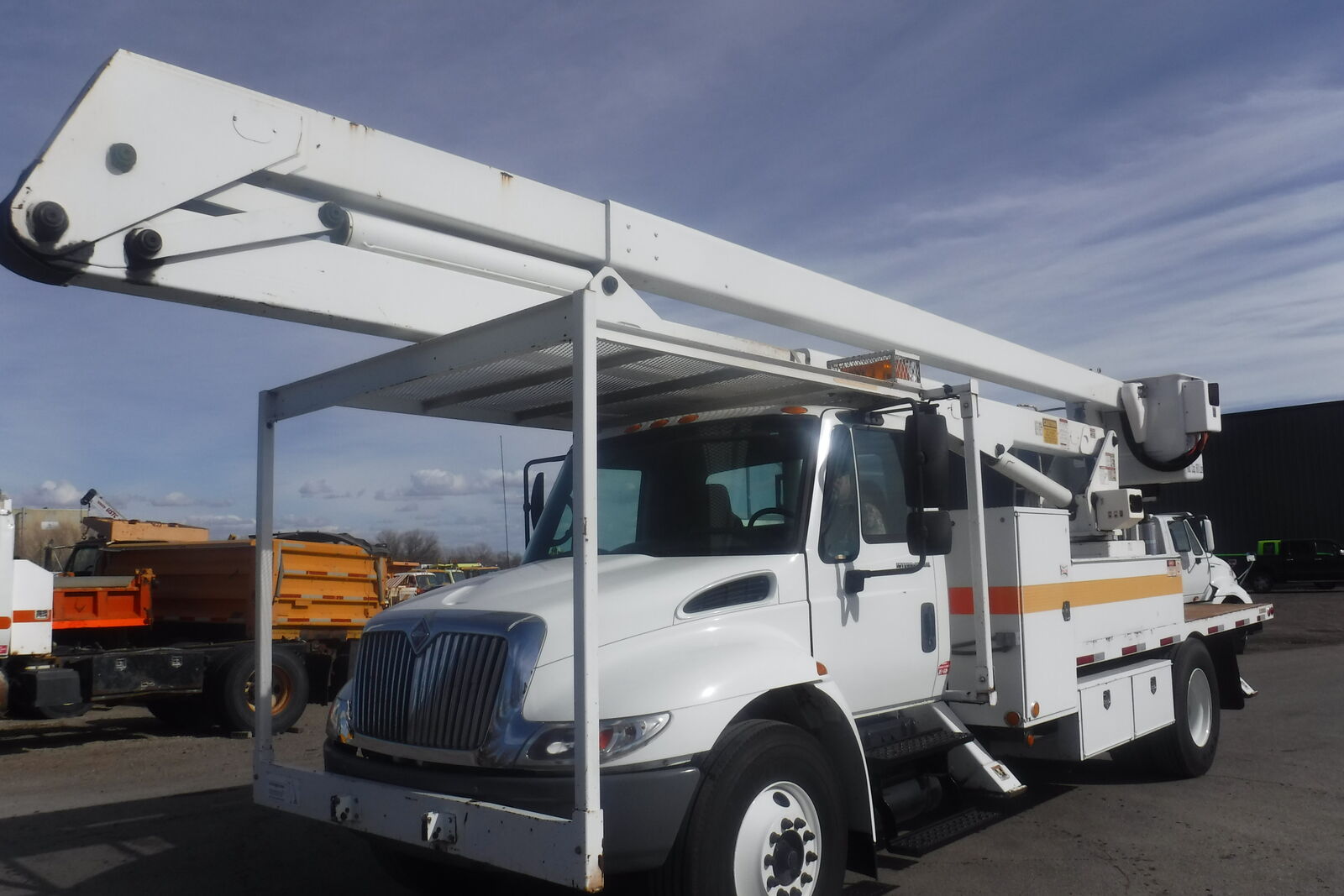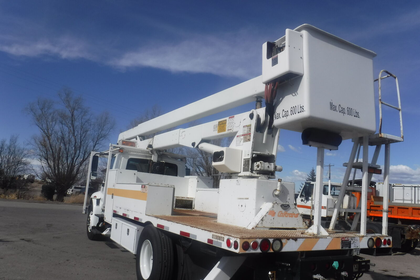 2003 IHC 4400 Bucket Truck with Lift All LAN 65-2E manlift. 72 Ft. working height and 65 Ft. to bottom of the bucket. 600 Lb. capacity double man bucket with dual 180 degree rotation. Single handle bucket controls. Insulated uppe rboom. Lower Boom insert. Continuous rotation. 4 outriggers . DT466 Diessel Allison 6 speed automatic. PS,AC, Retarder. 33K. GVW. Tires are 11R/22.5 with 80% on all. 239K miles. One owner former State DOT unit that is in near new condition. It has been well maintained. Runs, drives and operates like a new truck. Clean and ready to work. $21,900. Located in Twin Falls Id. Call 208-613-0050