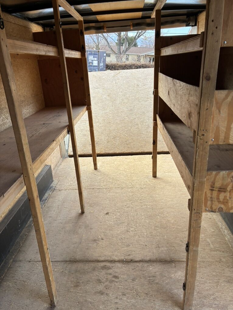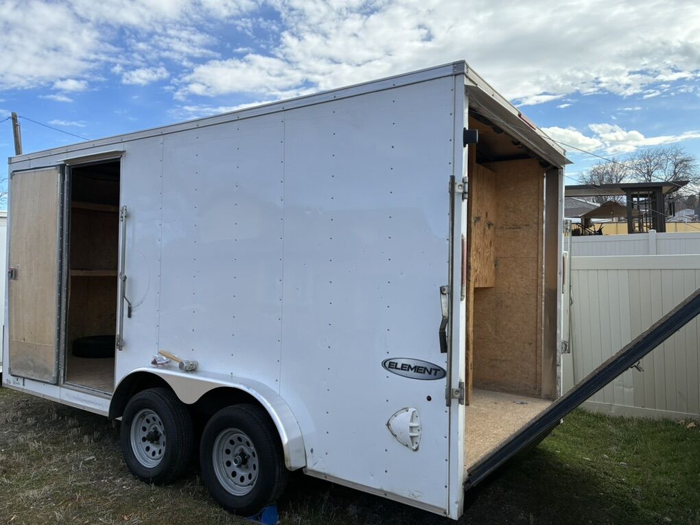 This is a 2017 in great condition. it has good tires, a ramp, and tall rear opening for UTVs. (7’ x 71” Tall) It currently it has construction shelving, but I’m planning on using it in a different trailer. It’s a good looking trailer that pulls great.2” 5/16” ball.