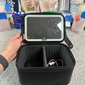 Keywords: cosmetic organizer, travel makeup bag, vanity bag, beauty case, makeup storage, professional makeup, makeup accessories, lighted mirror, USB light, faux leather, beauty tools, makeup artist, personal care storage