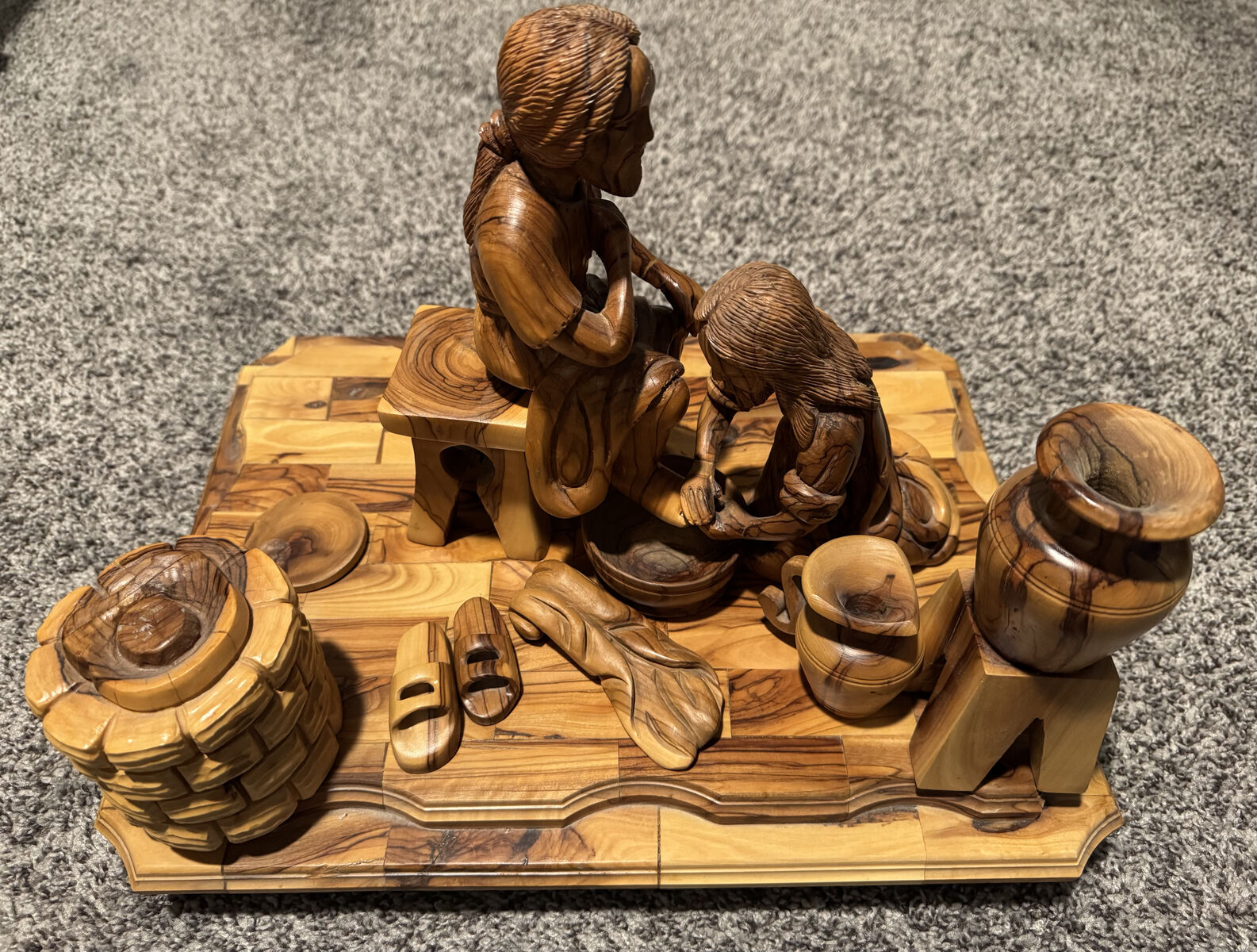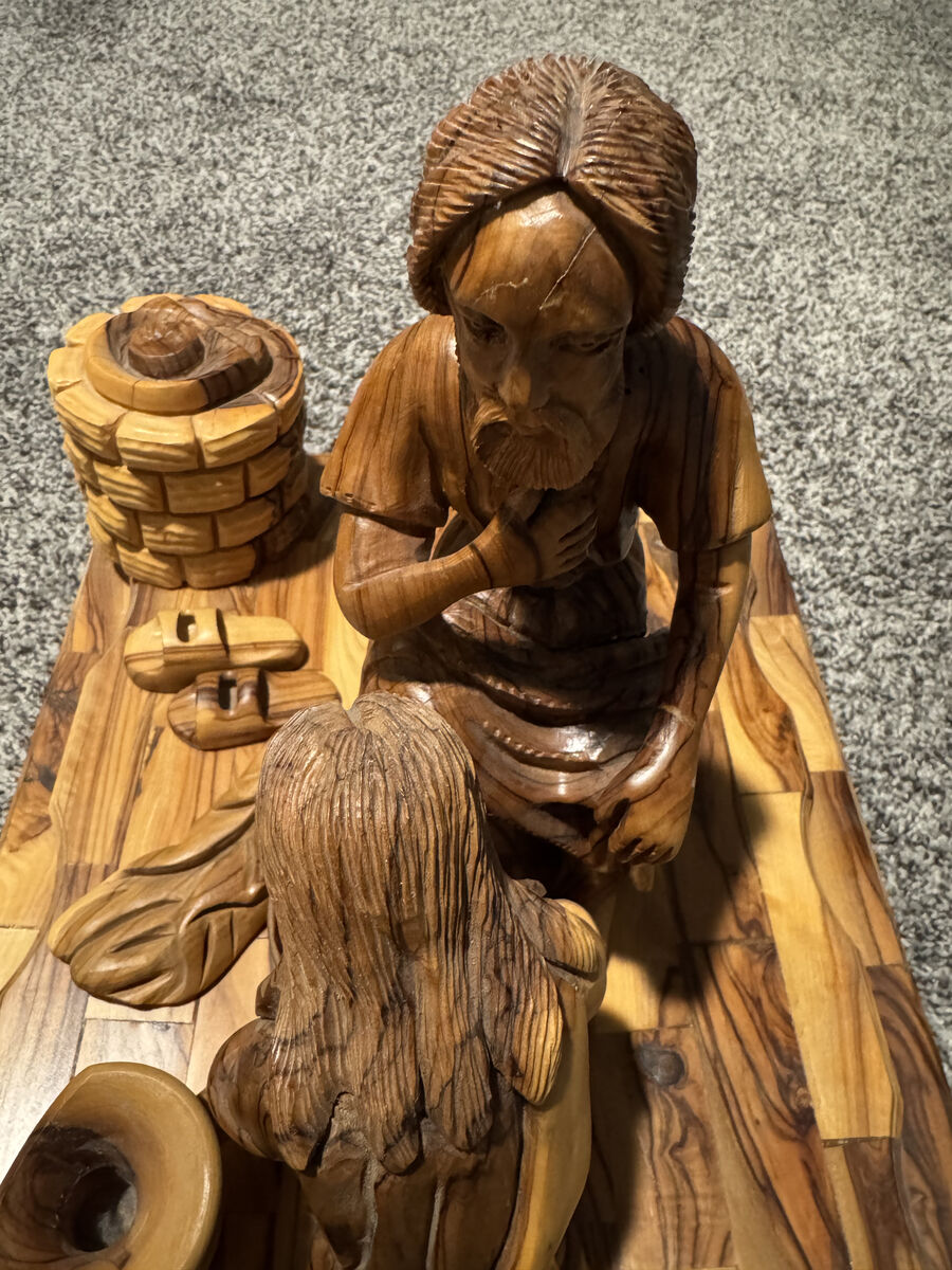 ZelleBeautiful, large olive wood religious carving purchased in Bethlehem (Holy Land). This piece depicts the powerful biblical scene of Jesus washing a disciple’s feet — a symbol of humility, service, and compassion.