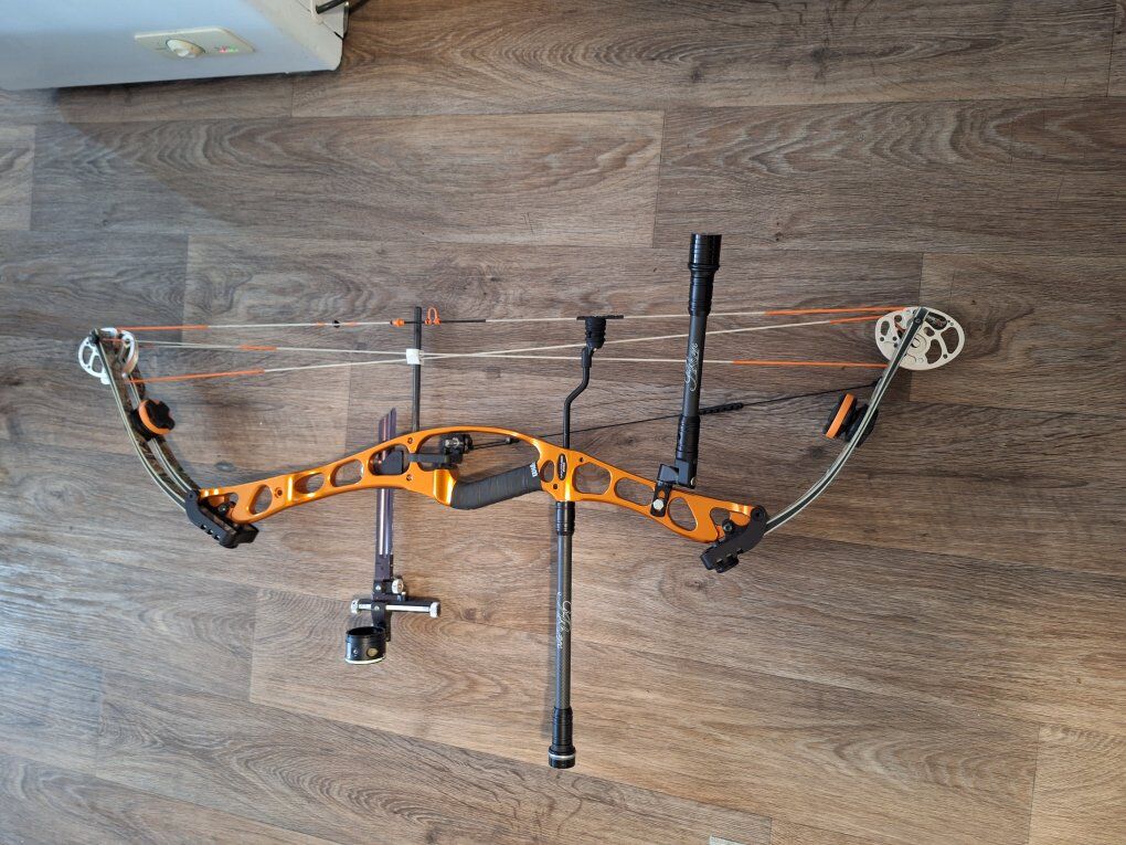 strings are still really good, 29" drawlength, goes up to 70# draw weight, currently set at 60# is in really good shape and ready to compete.