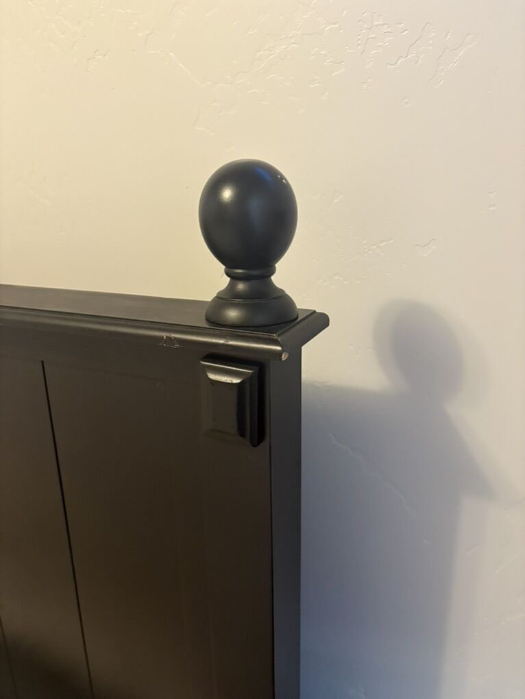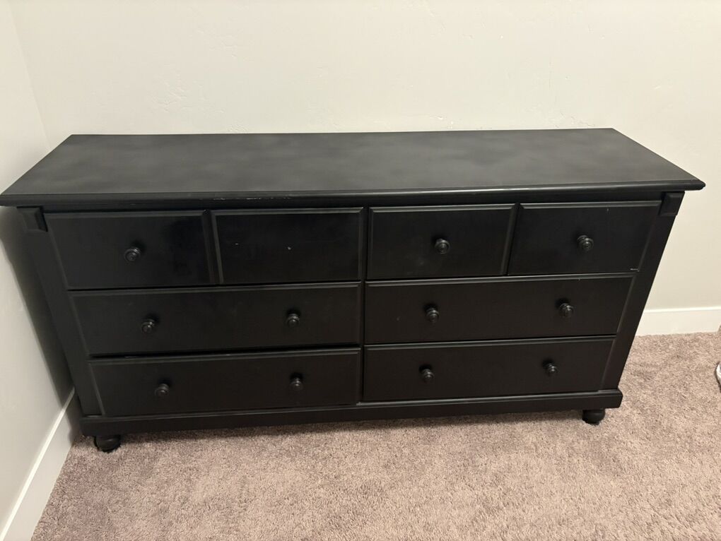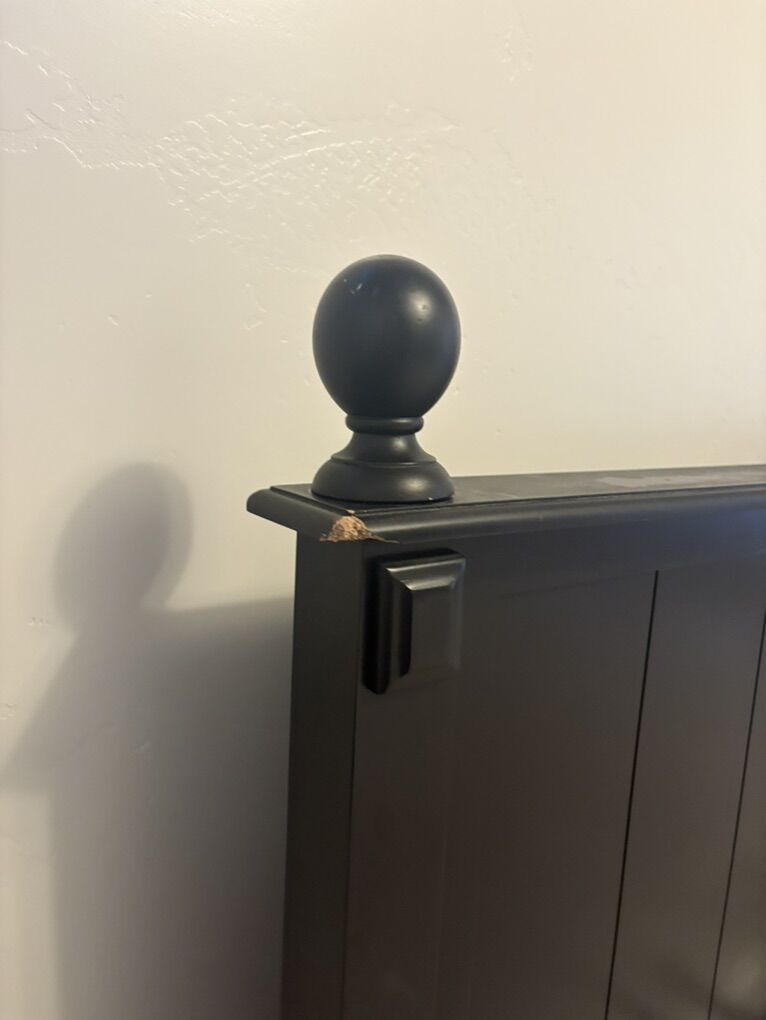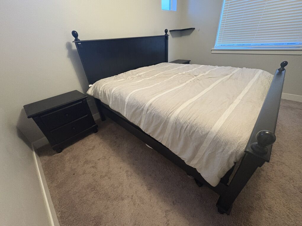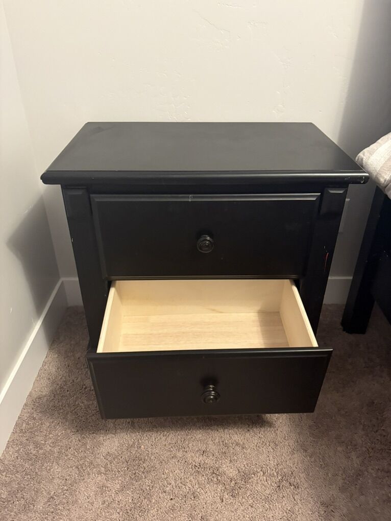 We have a matching Bed Frame, Night Stands & Dresser for sale. The headboard corner is a bit scuffed up. The bottom drawer of one of the night stands isn’t on the rail. Will sell all separate. Asking $350 for all together.