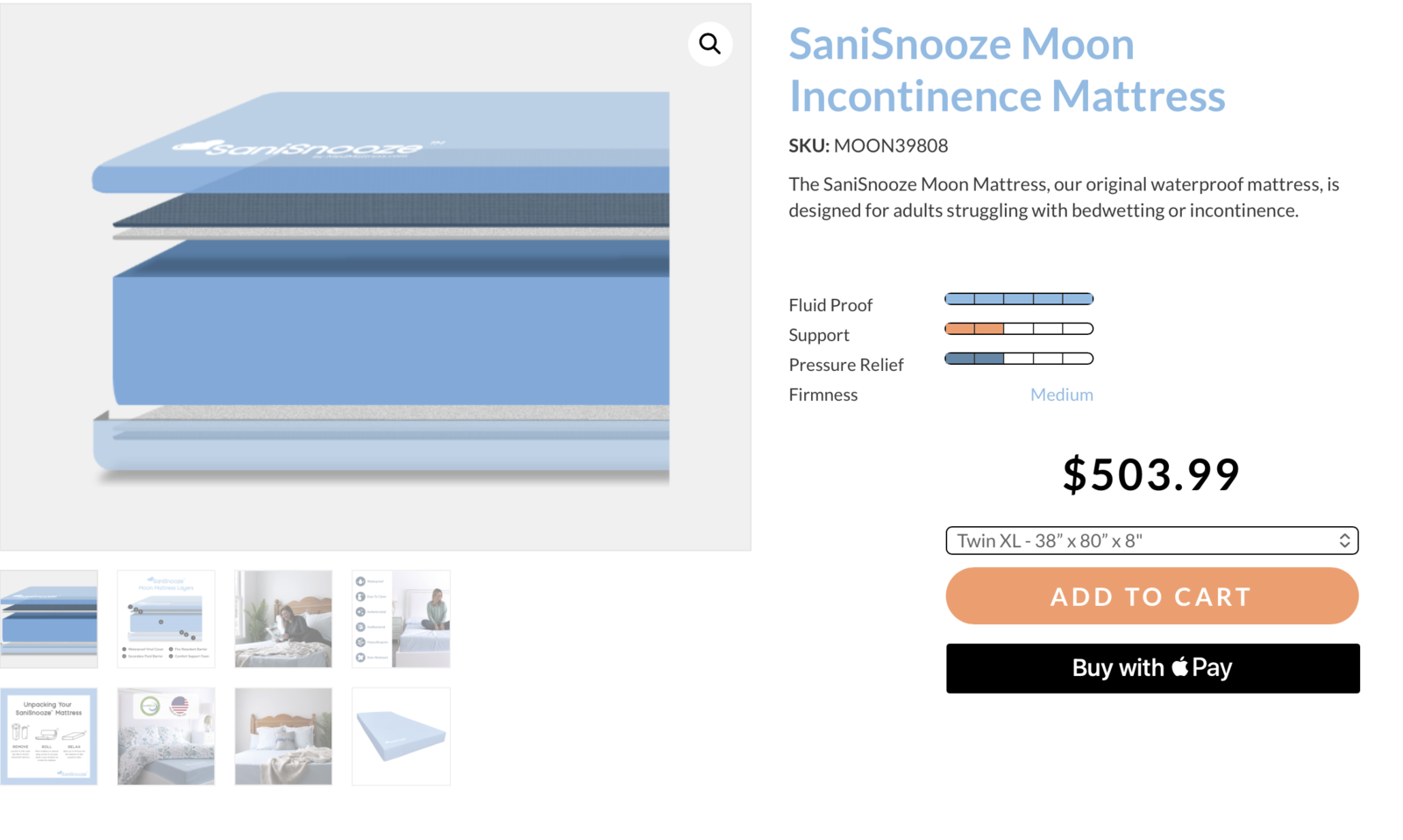 “The SaniSnooze Moon Mattress is the original bedwetting and incontinence mattress for adults. Our SaniSnooze Incontinence Mattress is made with an 8” deep, solid foam core with a soft-touch waterproof cover, providing ultimate comfort and the assurance that your mattress will remain dry all night long. The Moon Mattress features a secondary fluid proof barrier, keeping your mattress core dry all night long and making clean up quick and easy. Every SaniSnooze Mattress Cover helps keep household allergens, mold, mildew, moisture, dust mites and bed bugs from entering the mattress core.”