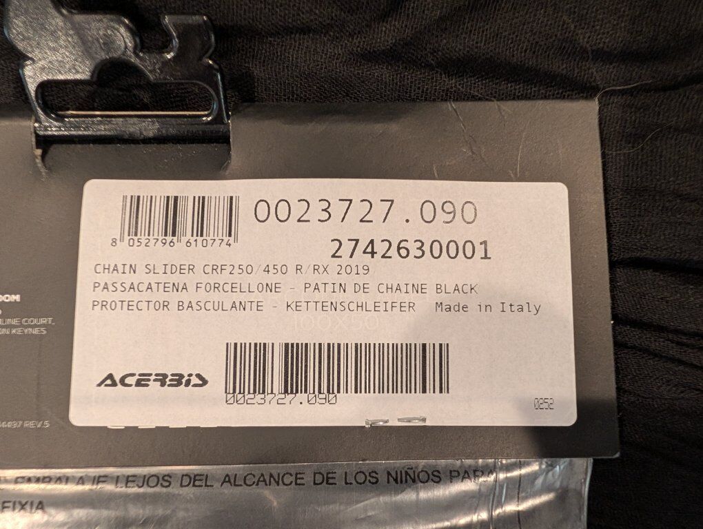 VenmoNEW in Package Acerbis Chain Slider CRF 250/450 R/RX 2019 The Acerbis Chain Slider is the simple recipe your bike needs to keep the chain in its place and your swingarm in one piece. Installation is a breeze. Since this slider is super flexible, you can simply spread it and slip it onto your swingarm before bolting it in place.