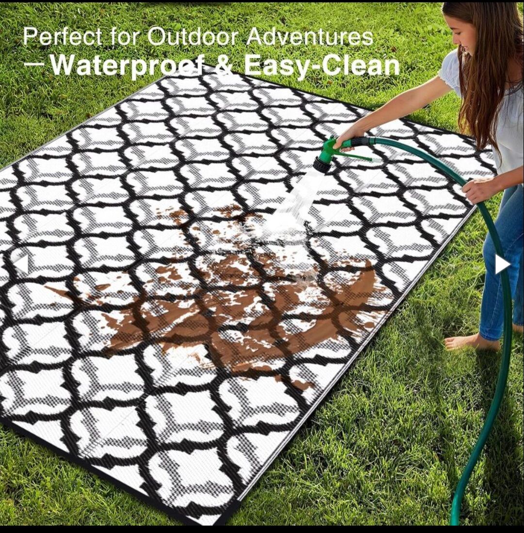 PayPalNEW OLANLY reversible outdoor rug. Waterproof, plastic straw rug with interlacing pattern. Lightweight, foldable, easy to clean and easy to store. Perfect to use for camping, as an RV mat, for a patio, baclcony or deck. Color is black and white.