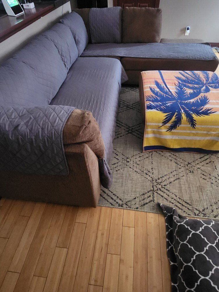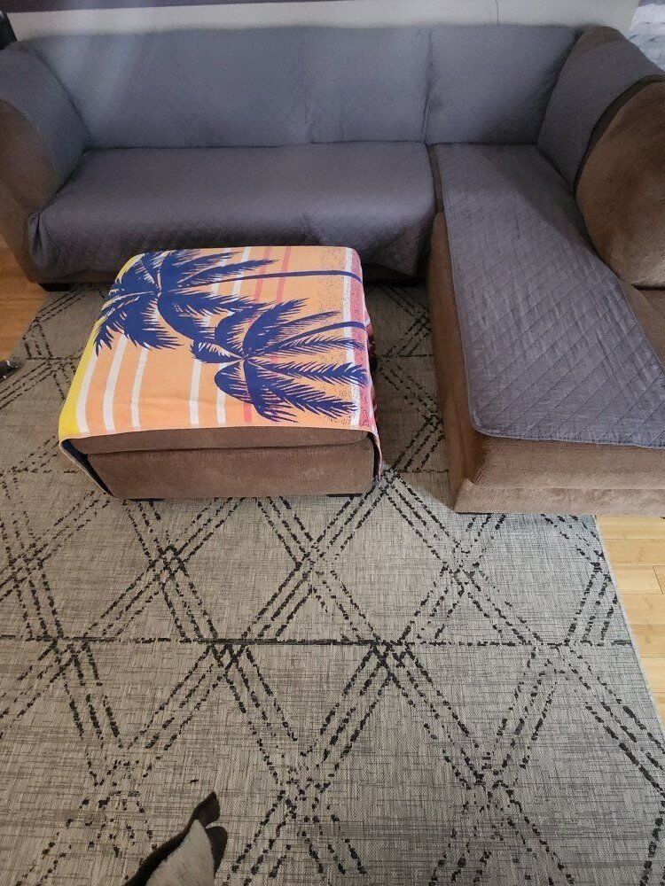 Comfy brown sectional sofa with an ottoman. Has a chaise lounge for extra relaxation. Plenty of seating available. Cushions are soft but firm. Pick- up only!