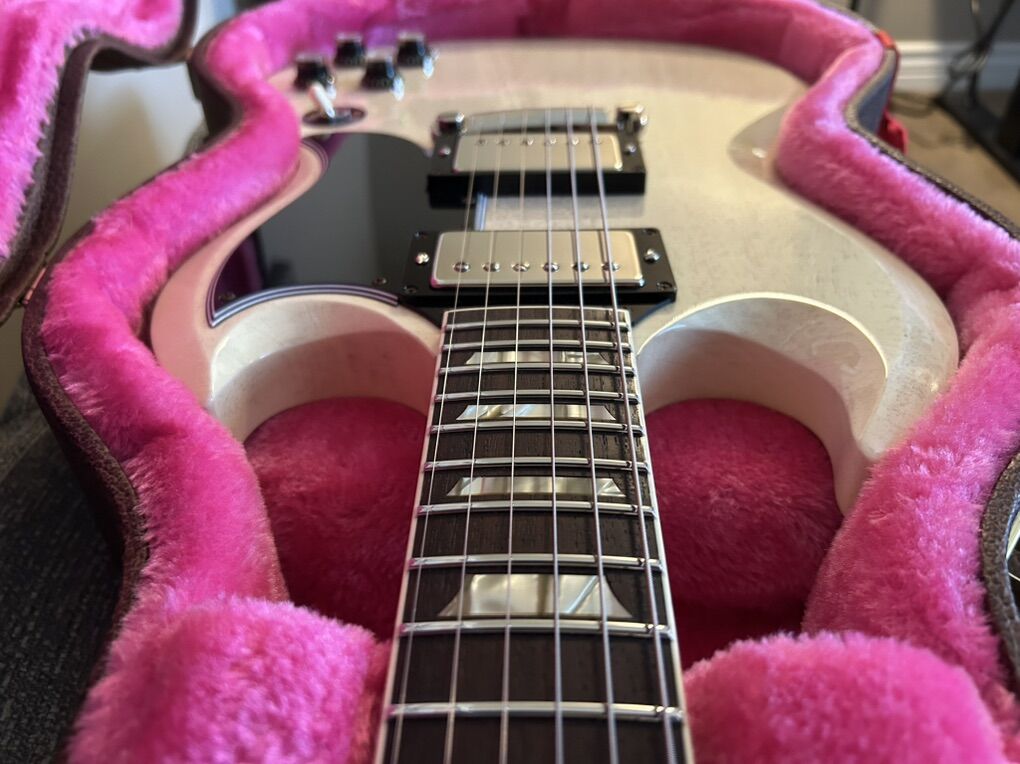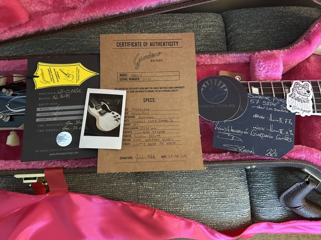 A few specs not listed in Certificate of Authenticity are: Absolute mint condition - no post production aging or wear Aged white finish - the aging is tasteful and not over the top 6.25lbs - despite being light on the shoulder, the sound is balanced and full Unique neck profile (0.89 at the 1st and 0.95 at the 12th) - less depth but fuller near the first frets; the shoulder thins while the depth getting slightly larger as you move up the neck - SUPER comfortable! Bone nut - no plastic here Super Jumbo Stainless Steel frets - this is on the spec sheet, but is worth calling out here. Giordano branded, hard-shell case included I am asking $6,000 (down from $6,500), net to me. I am open to reasonable offers, but no trades - please do not ask.