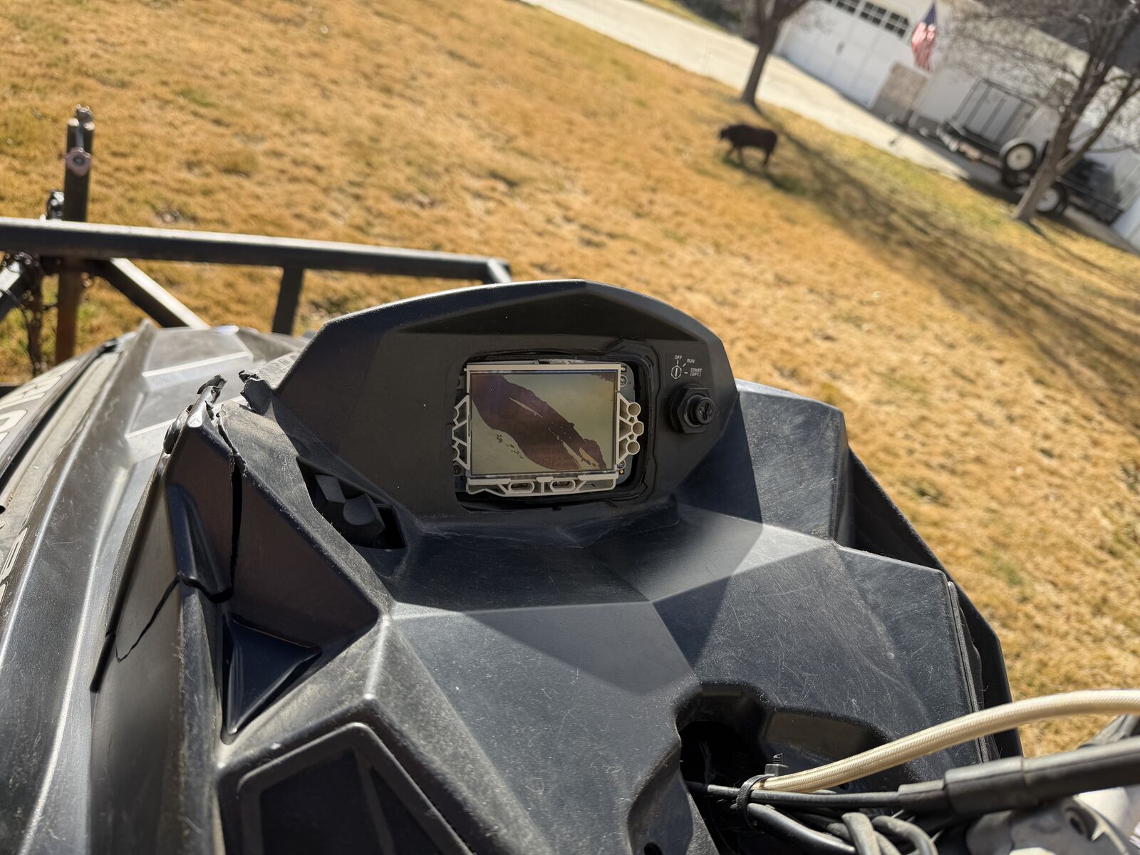 ZelleVery low miles, about 800. Runs great, starts easily. We rarely use this, it has always been in covered storage. The screen is broken but it runs great. Plastic housing on the left side is cracked. We've always used 100% synthetic oil. Cover included. The trailer is also for sale if you want it. 14x7 trailer is in good shape and is $950 more. No trades. Cash only.