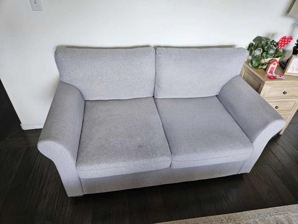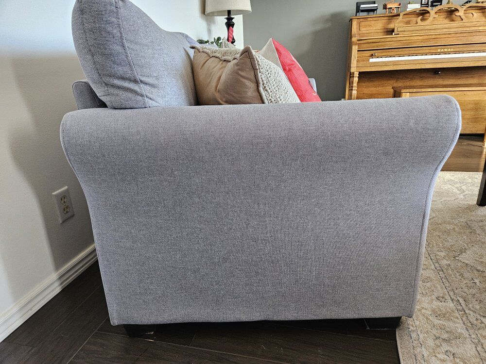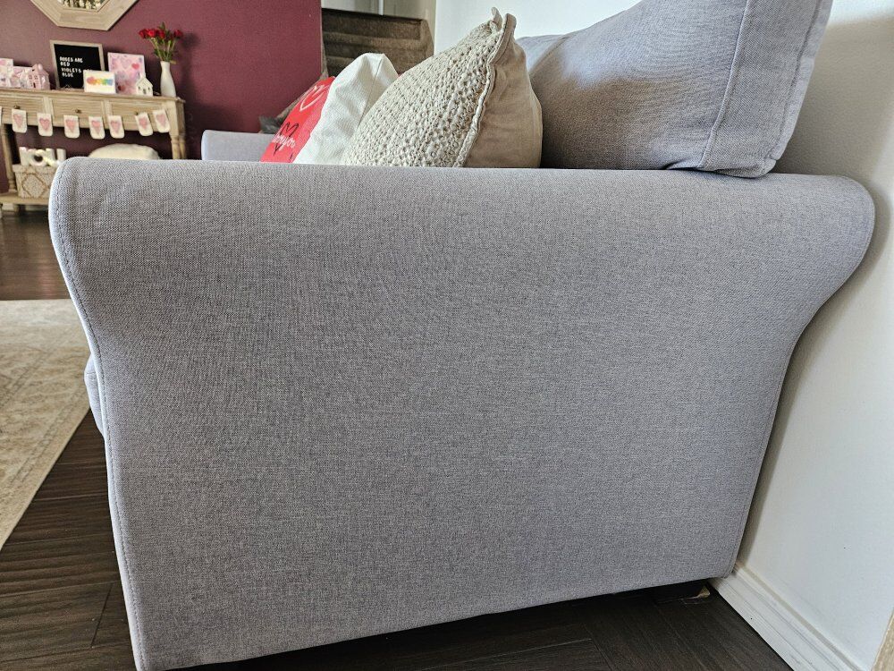 ZelleVery clean and comfortable grey loveseat for sale. Accent pillows not included. This has been kept in a smoke-free and pet-free home, so there are no odors or hair—perfect if you have allergies!