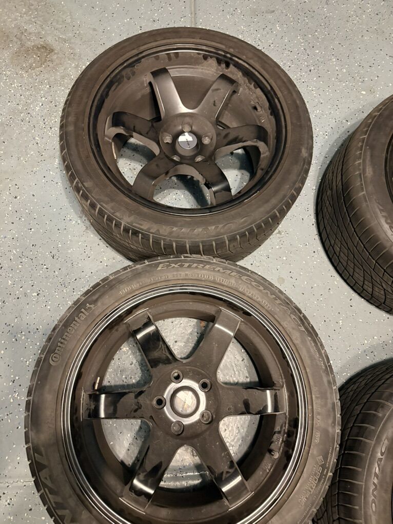 I have a set of avid av06 wheels with Continental extreme tires, have about 60-70 tread left . in amazing condition will come with lugs and lug tool. It is a 18 inch wheel with 22 offset.