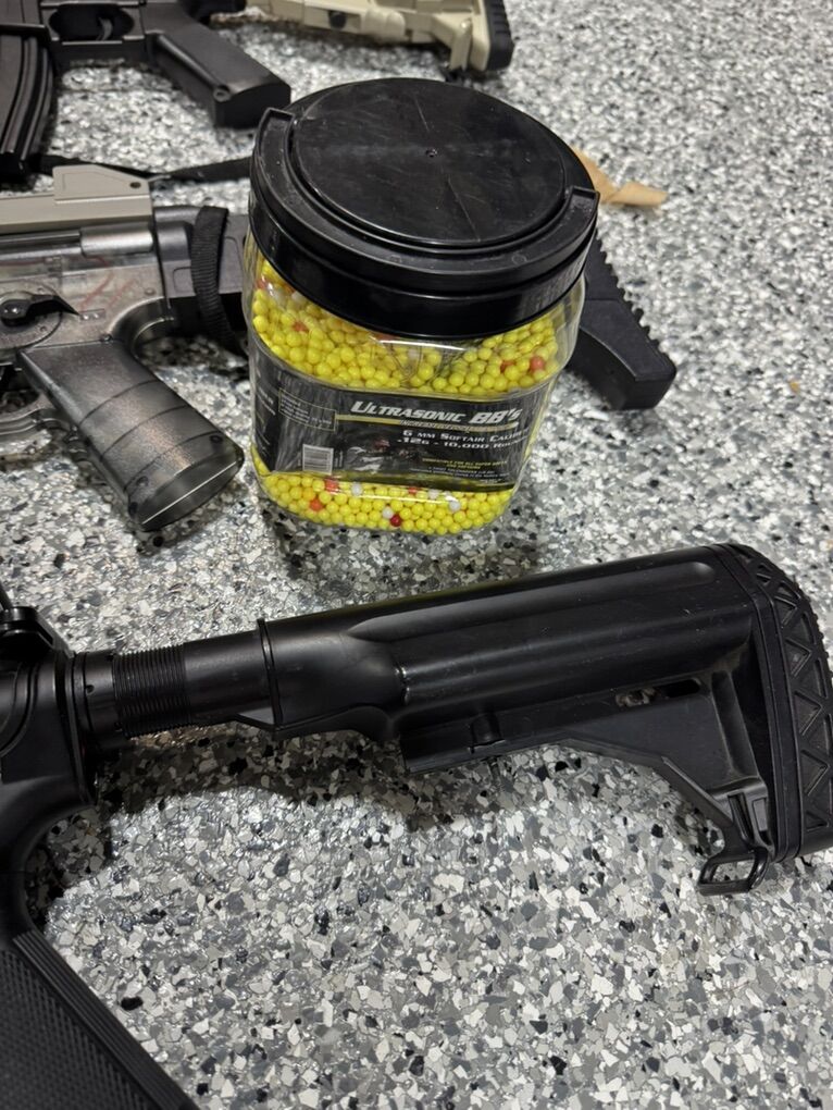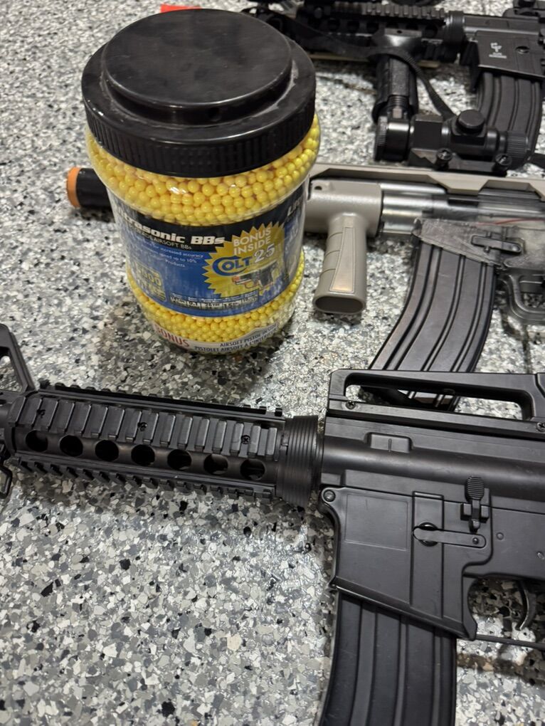 I have a couple air soft rifles, kids don’t use them anymore. The AR style second from bottom is heavier made of metal. Comes with everything you see. Cleaning out garage so take a look at my other listings. Thanks
