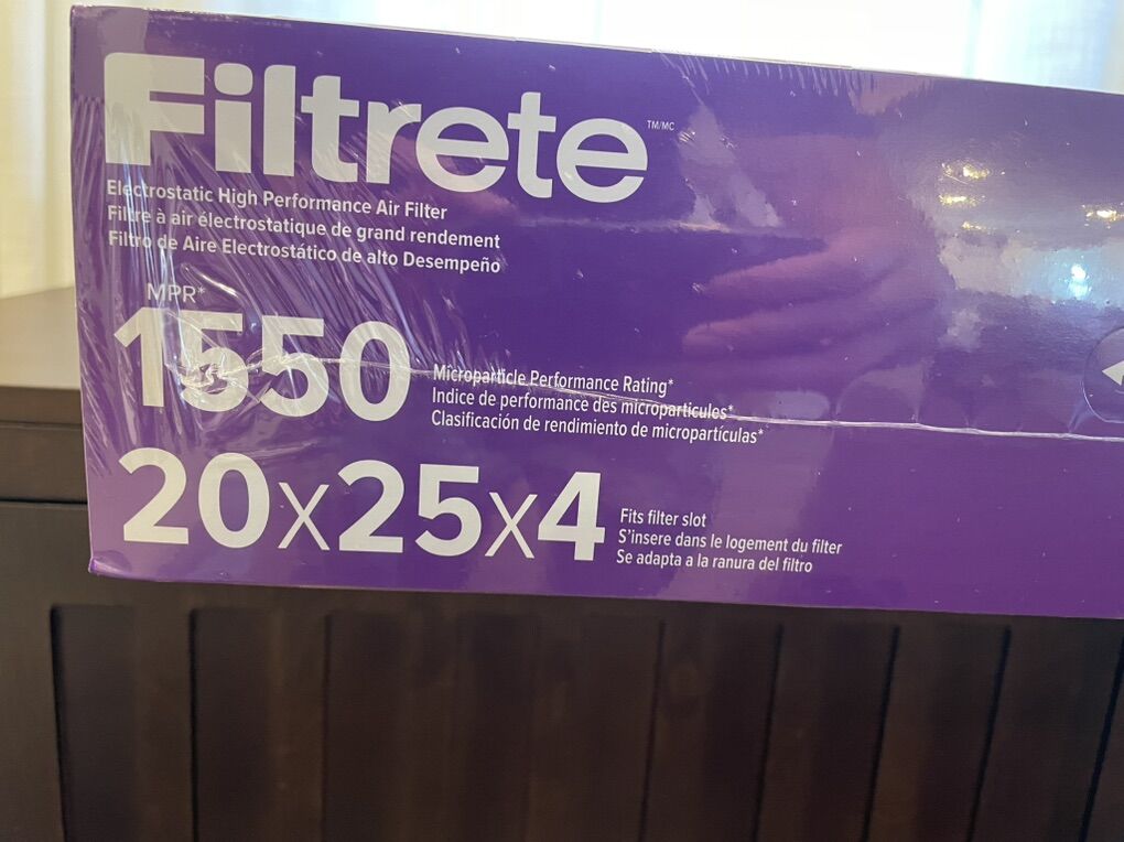 • Brand: Filtrete by 3M • Model: 1550 MPR (Allergen, Bacteria & Virus) • Size: 20 x 25 x 4 • Actual Size: 19.88” x 24.88” x 4.38” • Lifespan: Up to 12 months • High‑performance electrostatic filtration • Helps capture:• Allergens • Bacteria • Viruses • Dust & airborne particles