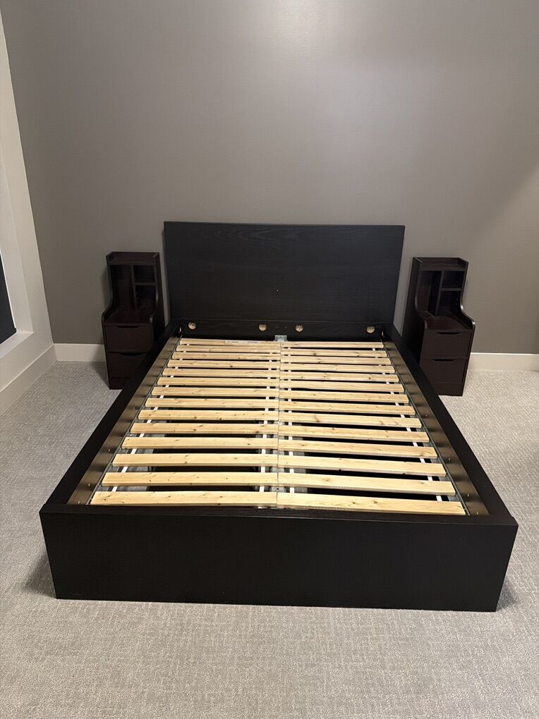 VenmoSelling my Full size IKEA Malm bed frame in dark brown. Bed comes with 2 drawers that slide underneath. There are also 2 Amazon night stands in dark brown. Retails for $249 without the drawers.