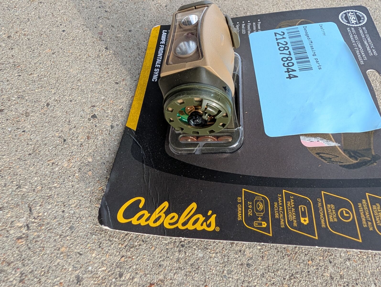 Headlamp has been marked down remarkably due to it missing a cap on the end. It has never been opened, so it is unsure if it works properly, but the price of the brand new batteries alone is worth the risk to potentially save a ton of money on a great headlamp.