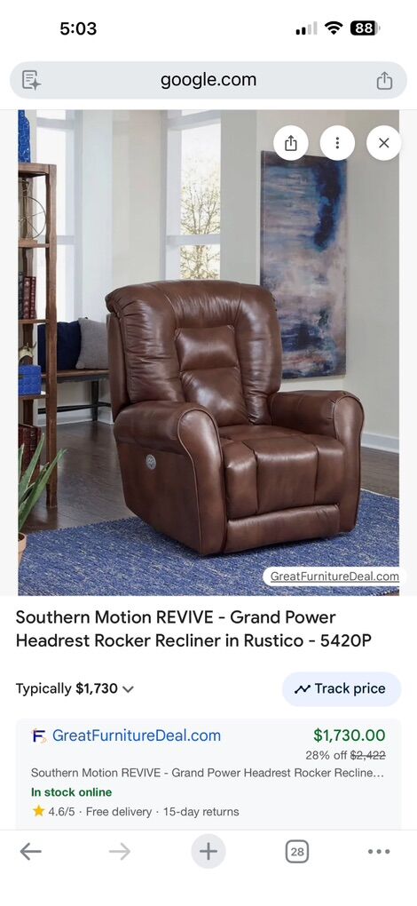 We’re selling our Southern Motion REVIVE “Grand” power recliner in Rustico brown leather. It’s been a super comfortable chair for TV nights and relaxing, but we’re rearranging and no longer have space for it.