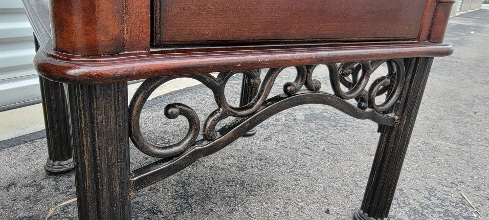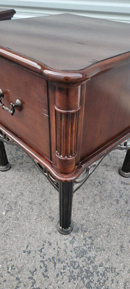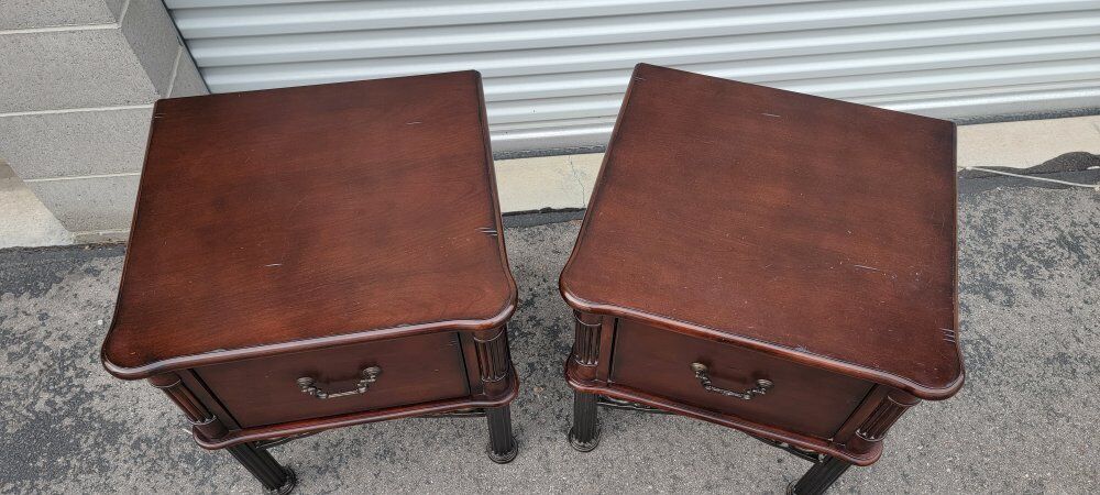 ZelleThese nightstands are high-quality. Made with solid wood with iron legs and accents. They're in great condition with minimal small scratches.