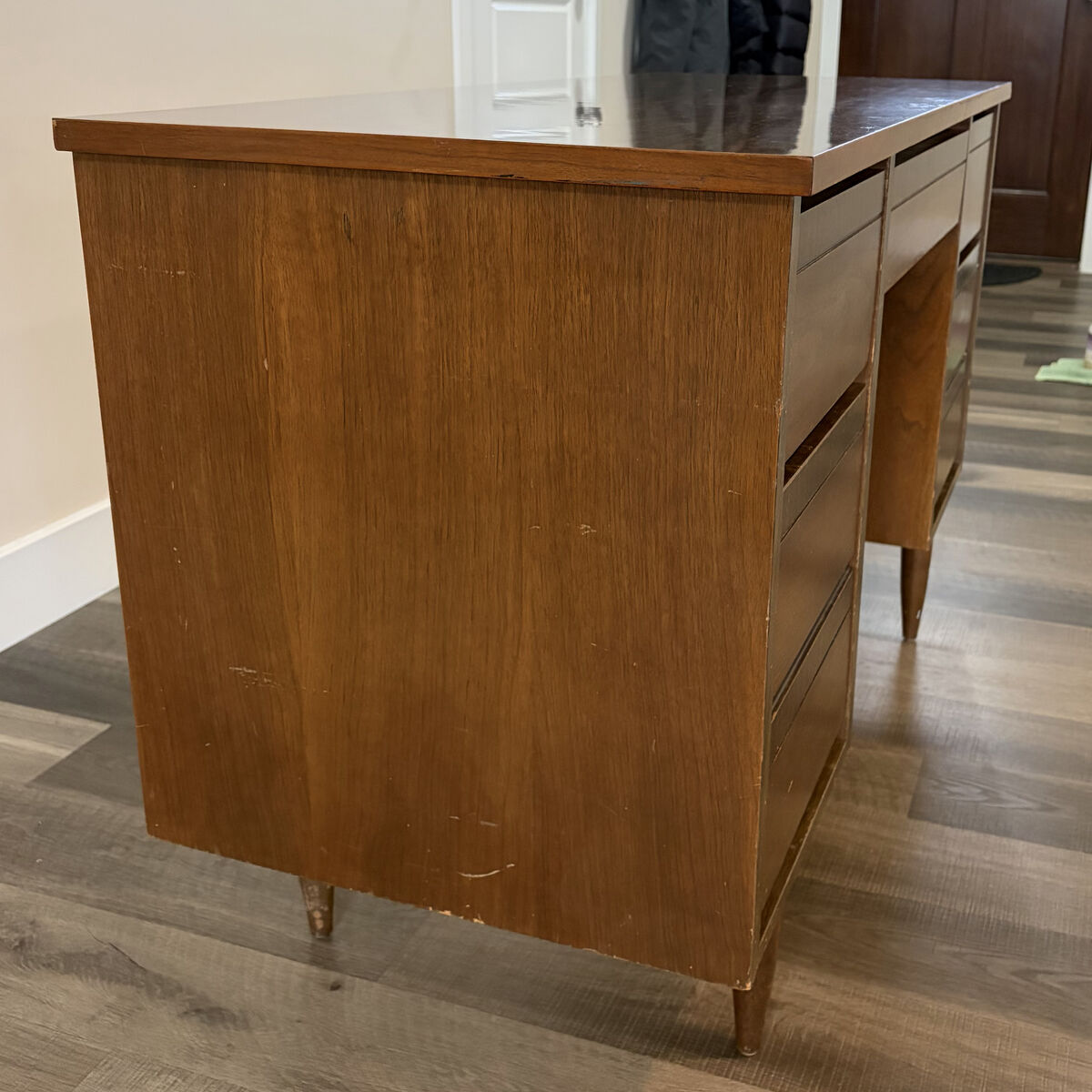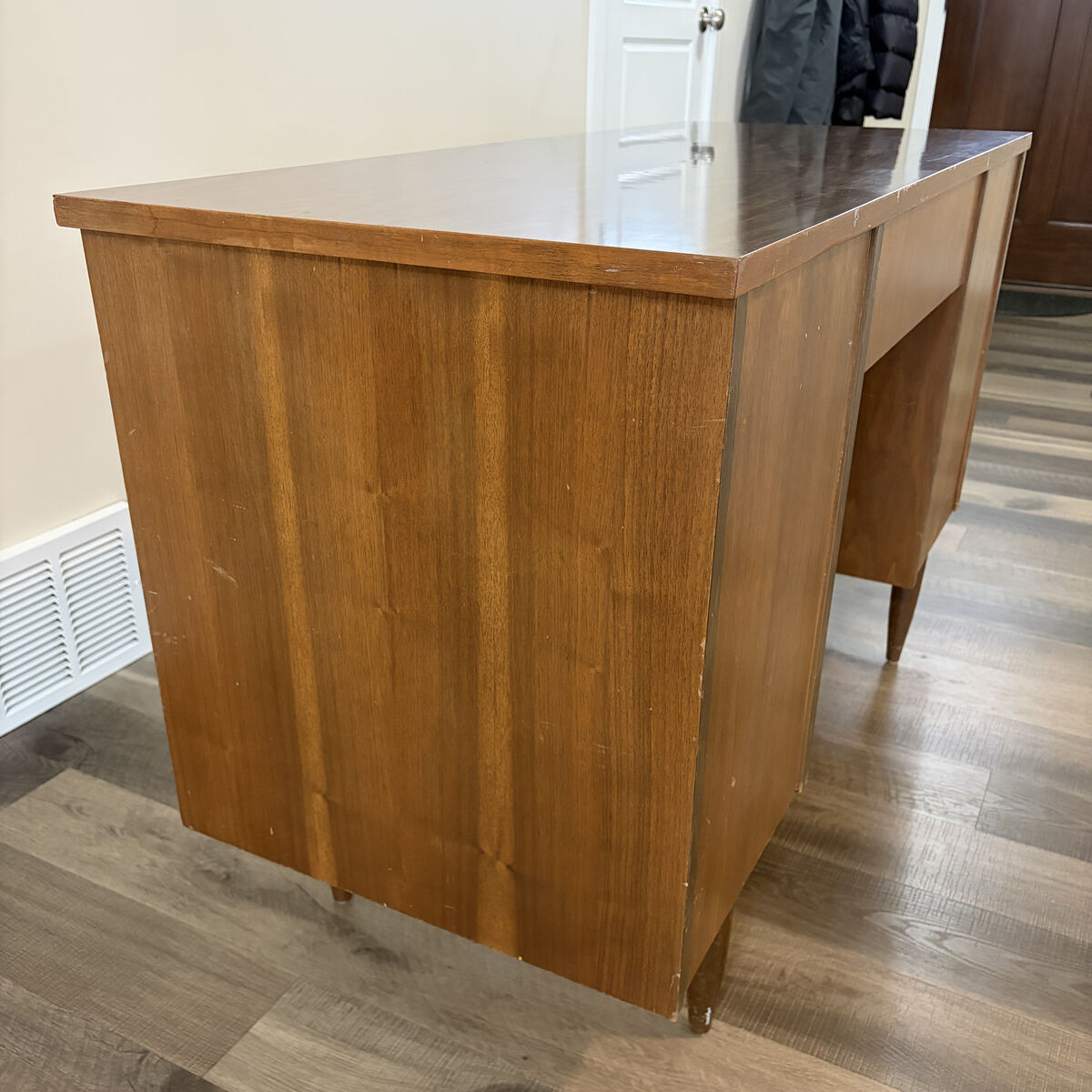 VenmoVintage mid-century modern desk. Featuring 5 drawers. One drawer is a filing cabinet. The legs twist on. Sturdy desk with minimal wear given its age.