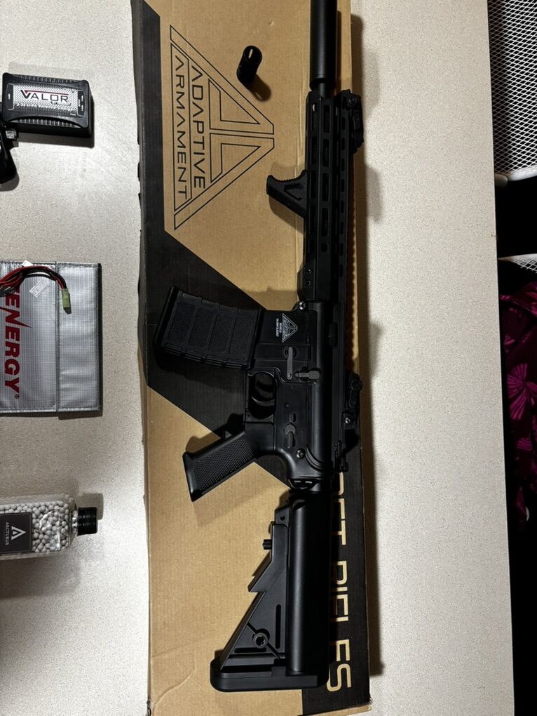 Adaptive Armament m4 with a grip and suppressor. Comes with .28 gram bbs and a battery and charger and lipo bag. Need this gone by Wednesday (I know super short notice) so shoot offers asap! Asking for 175 OBO