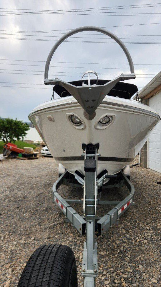 Includes trailer, snap on travel cover, storage cover, Bimini top with full cabin enclosure. Has full head, on board 12v fridge and sink with fresh water system.