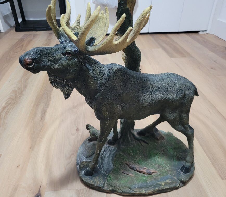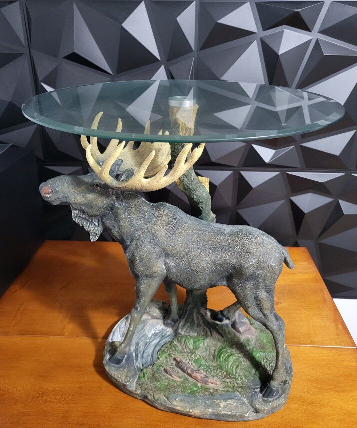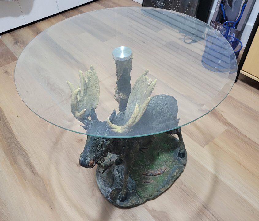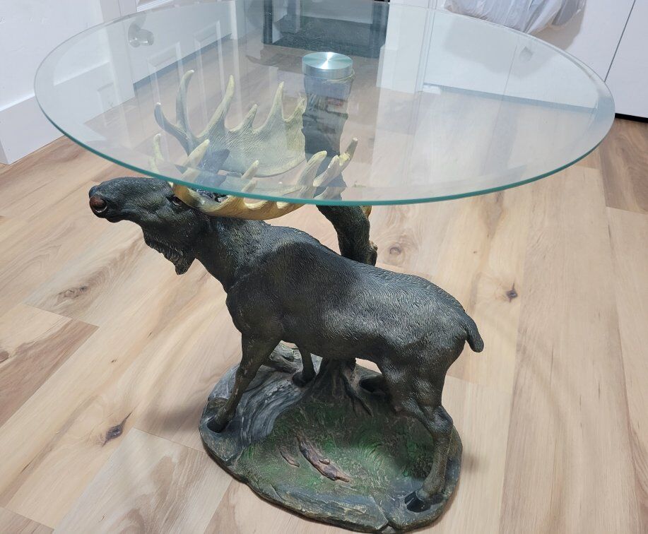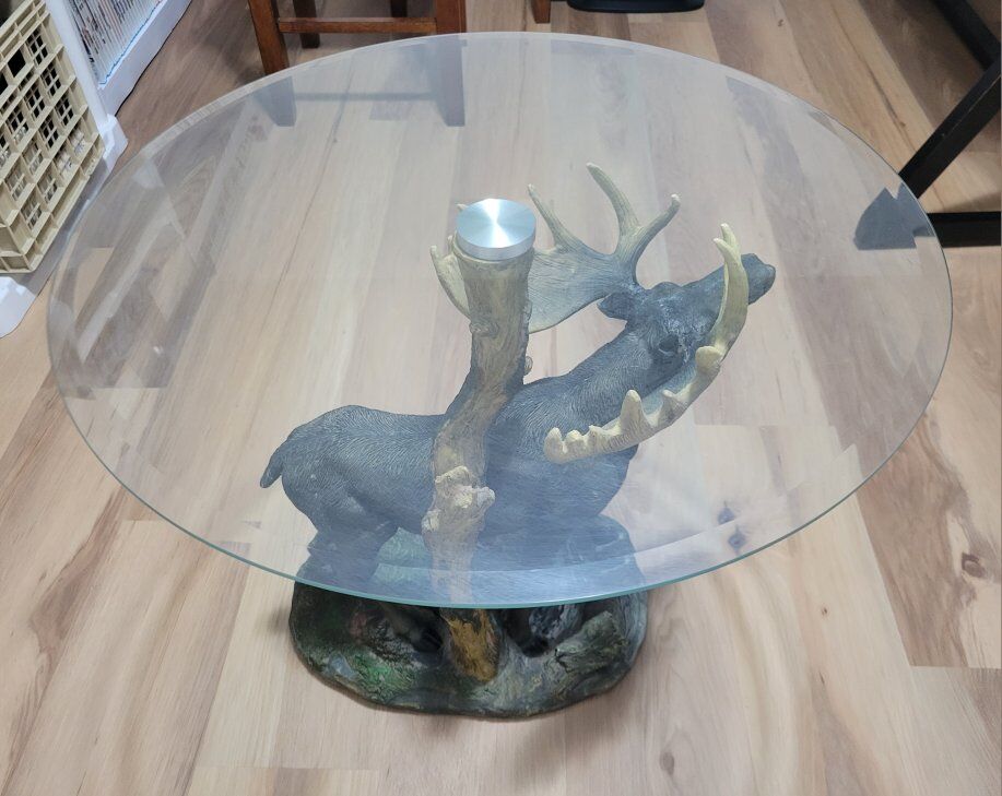 Oval glass coffee table with a Moose-shaped base. Dimensions: ( 21" x 22" )Good Condition! inf 702 3558824