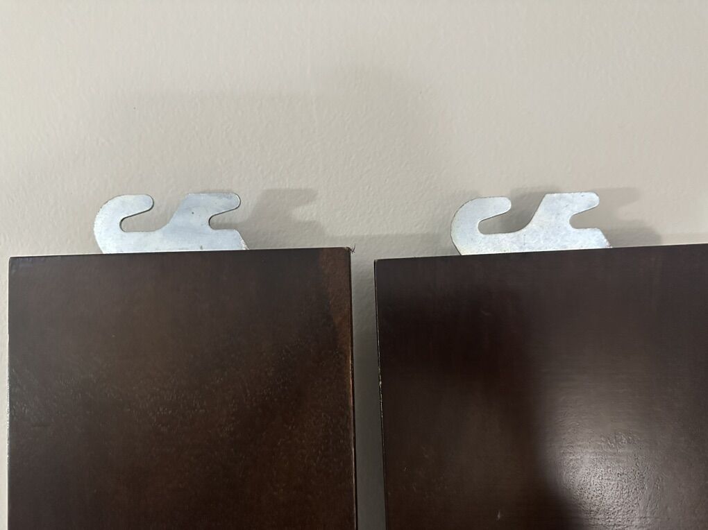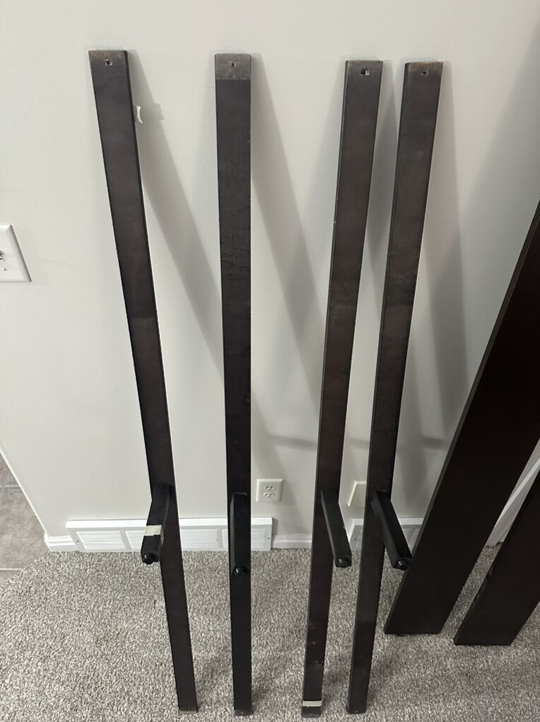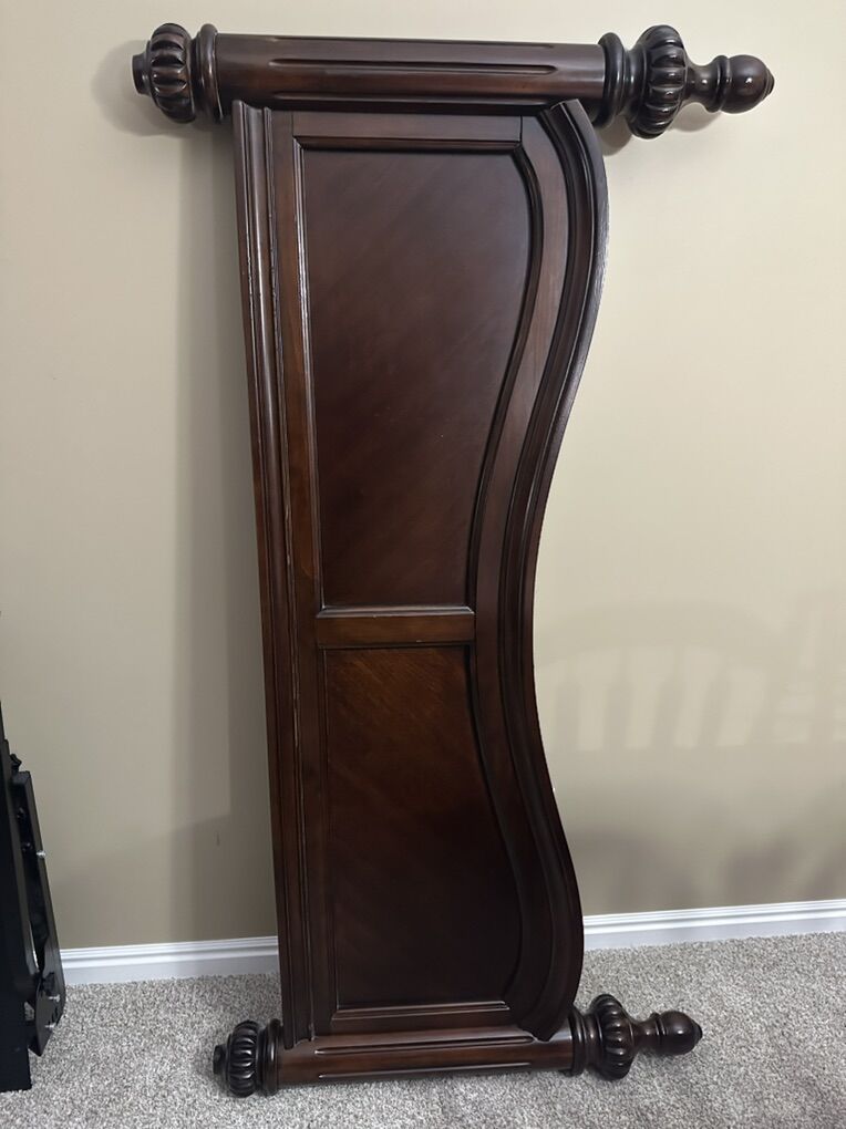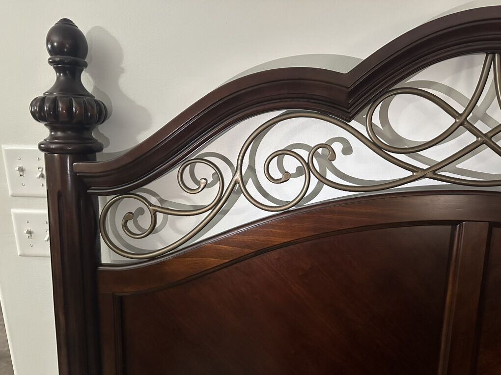 VenmoQueen size bed frame with headboard, footboard, rails, and slats. Dark cherry finish with decorative metal scrollwork. Good condition