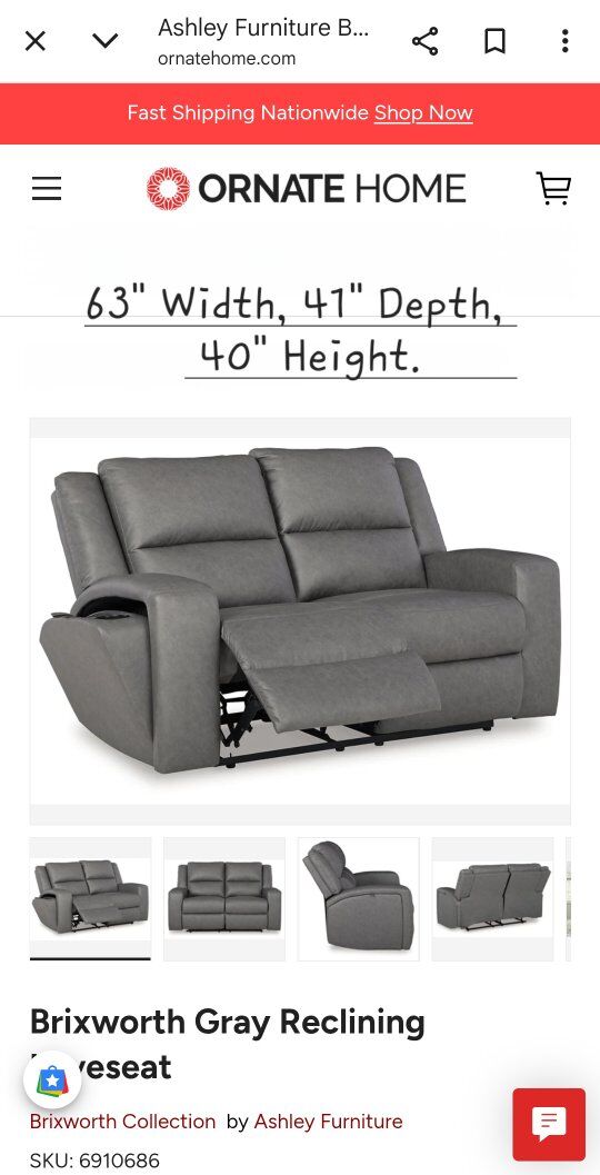 Dimensions: Loveseat: 63"W x 41"D x 40"H Recliner: 40"W x 41"D x 40"H