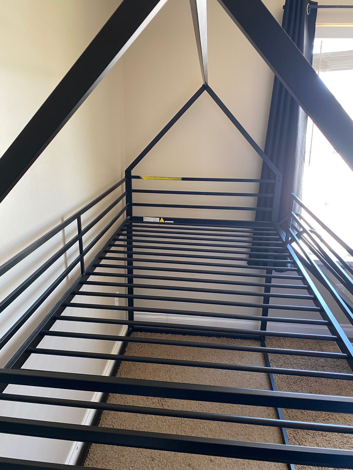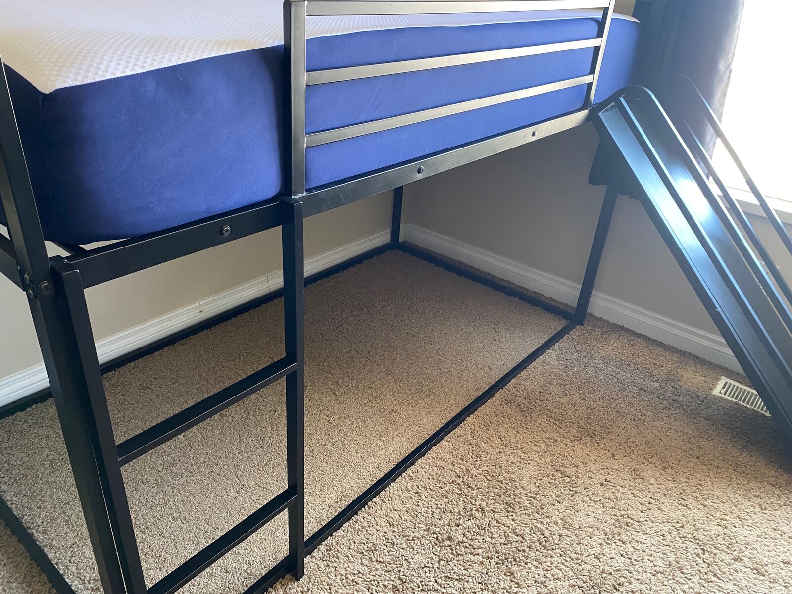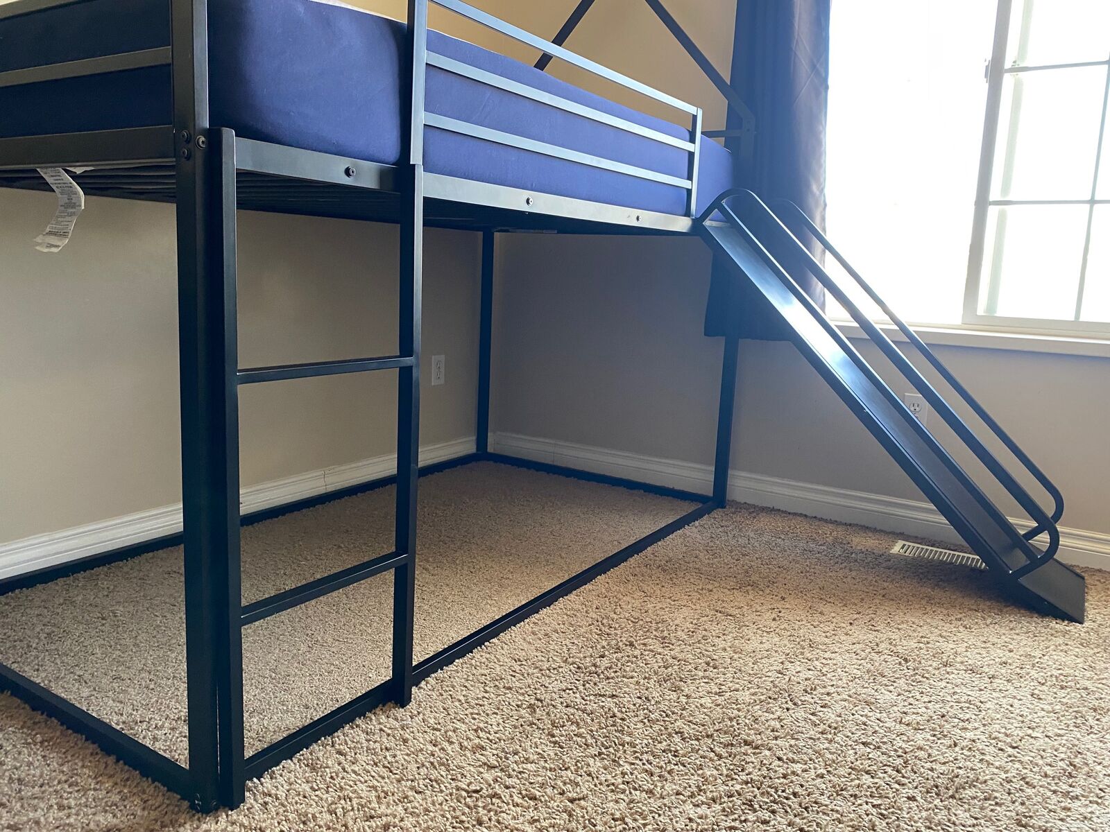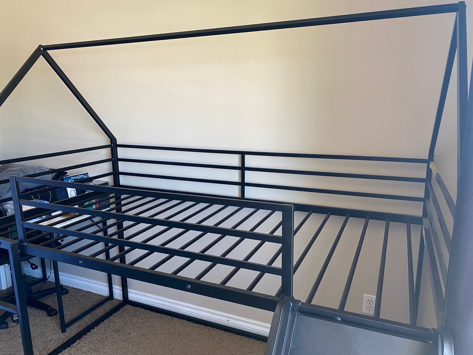 ZelleHarper & Bright Designs twin over twin house bunk bed with slide and ladder, solid metal frame, black, upper bunk weight capacity is 220lbs. The slide and ladder can be installed right or left. You can use it as a loft bed with a play space underneath, or put a mattress on the bottom and have 2 bunks. See photos for all dimensions.