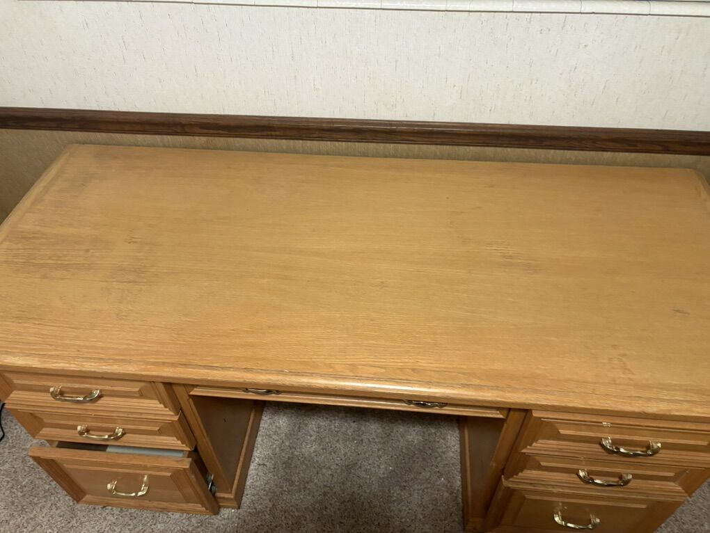 VenmoWood desk in decent condition, no major chips or scratches in the wood/stain but the drawers have some drawings in them