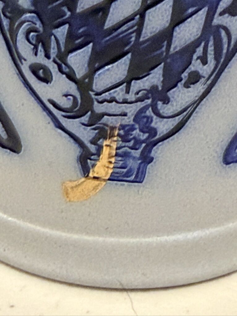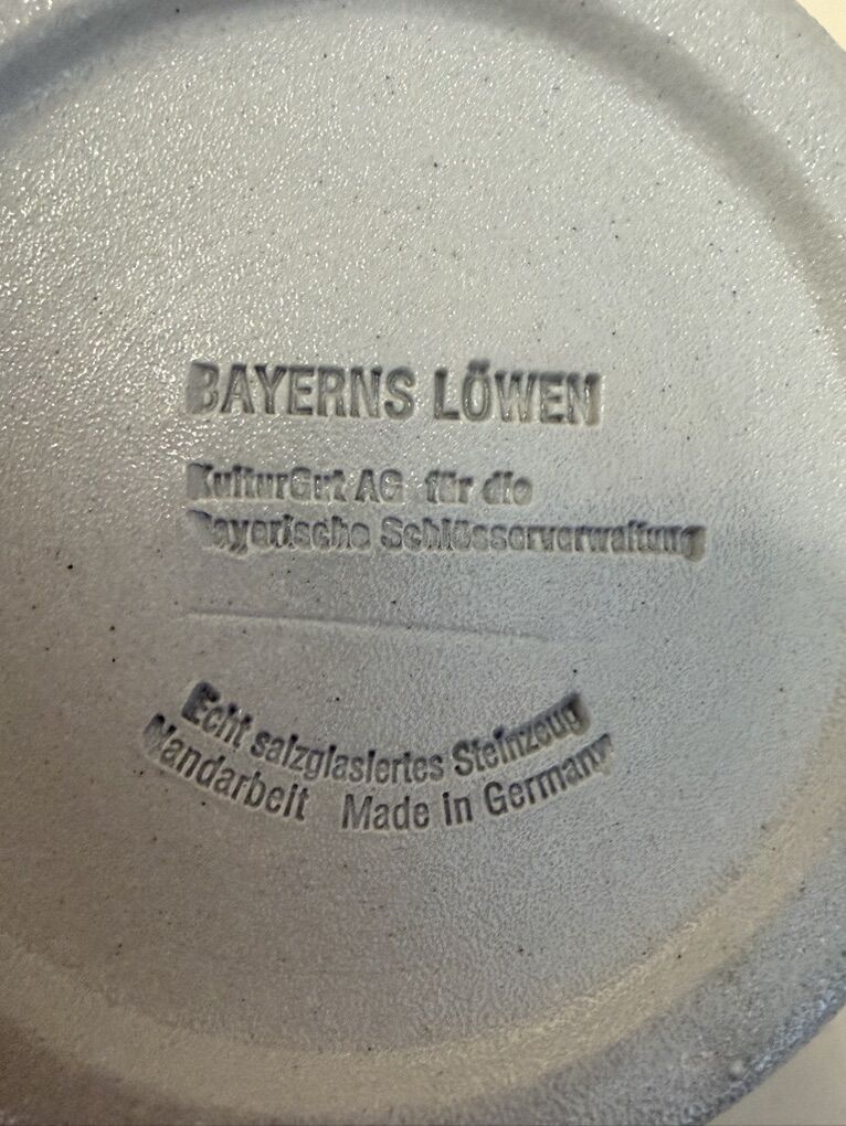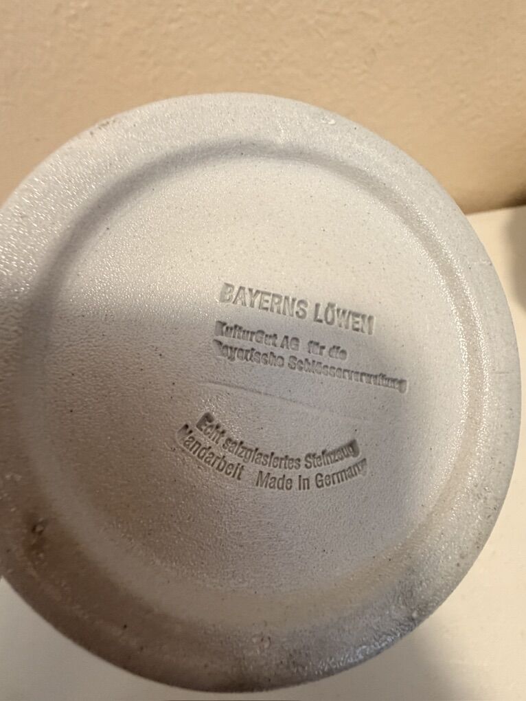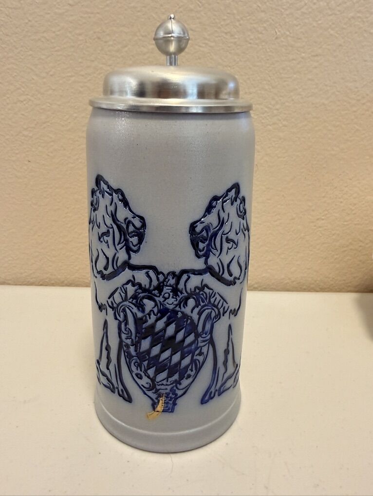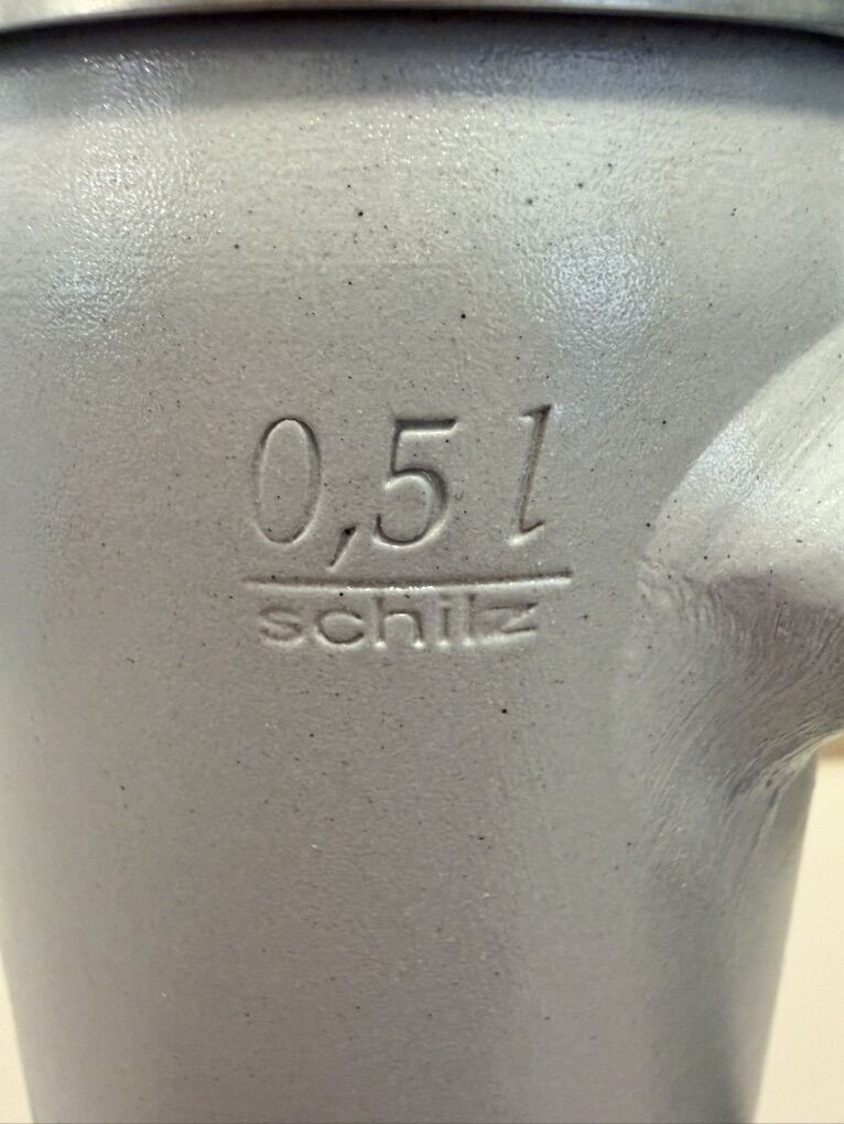 VenmoGerman Beer Stine made in Germany. Says Schilz 0.51 on the side. Maybe that means .5 Liters? Aluminum lid opens and closes nicely. Has magestic lions on either side with a gold accent markting in the bottom center.