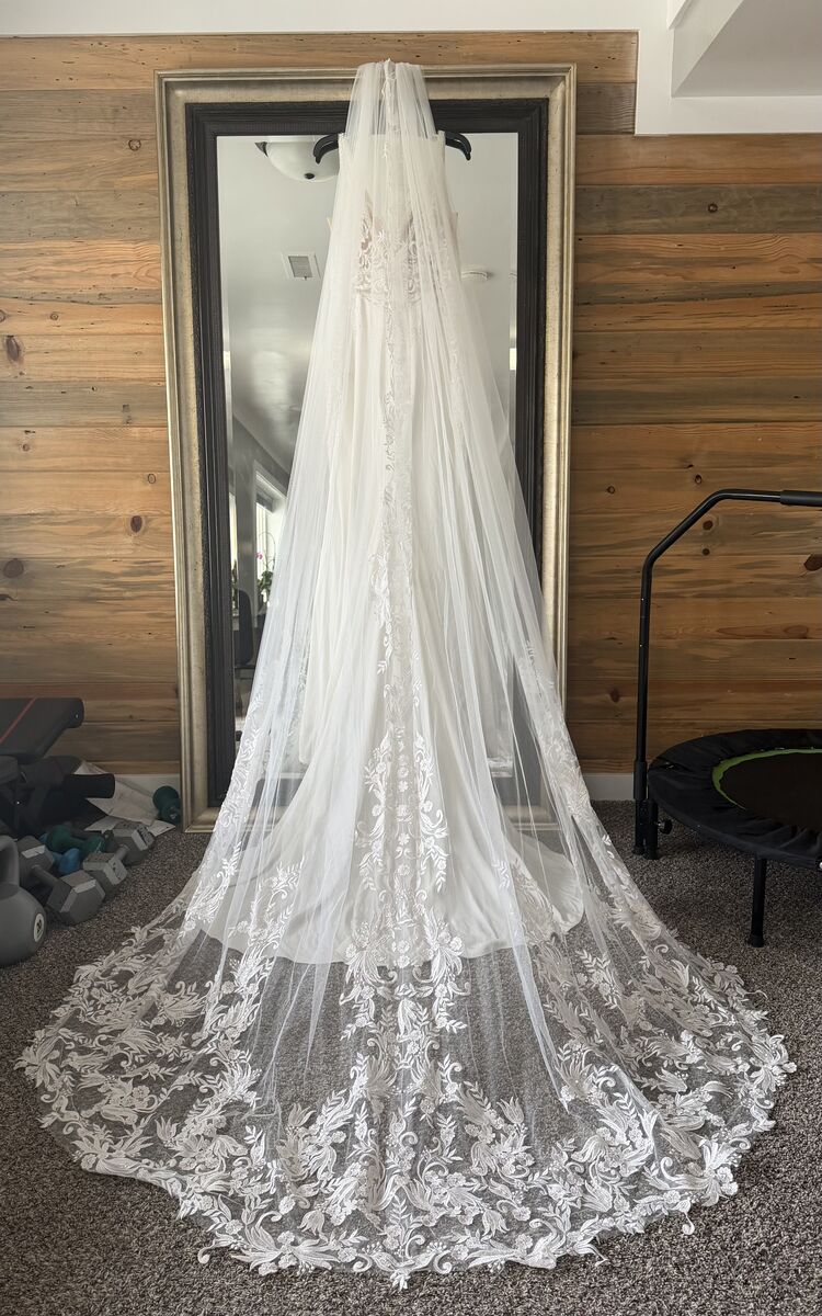 VenmoA harmony of simple and embellished. A classic yet modern silhouette. A crepe V-neck wedding dress with style and sophistication to spare. Dress is size 10/12 and includes a beautiful matching vail.