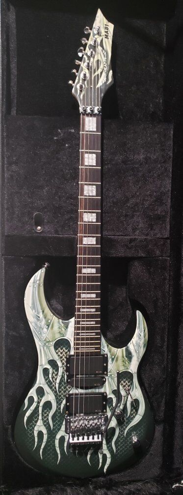 The Dean Michael Angelo Batio Armored Flame Electric Guitar is spec’d by Batio to be an incredibly fast guitar. Its neck is super thin, slightly rounded for extra comfort and joins the body at a straight angle for extended playability. It has an ebony fingerboard and block inlays that are easy to spot on stage. The alder body has a double cutaway with beveled edges and is covered in a custom “Armored Flame” Finish that is sure to stand out wherever you perform. This signature guitar is loaded with EMG active pickups and has a Floyd Rose Original tremolo bridge, nickel hardware, and Grover