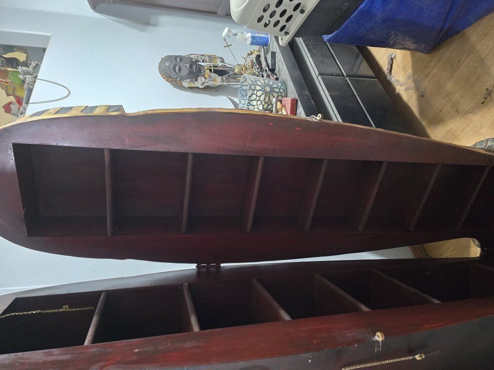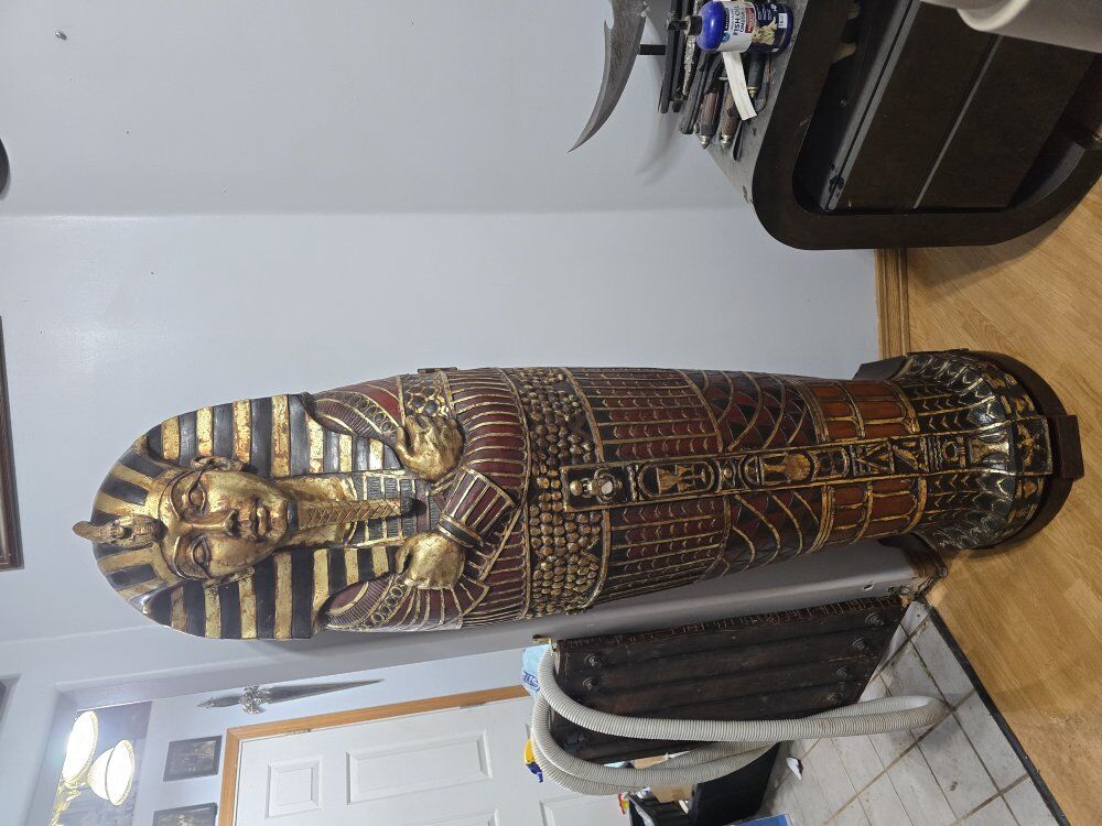VenmoCommand attention in any room with this stunning, life-size replica of King Tutankhamun’s sarcophagus. More than just a decorative statue, this impressive piece is a functional storage cabinet designed in the "Egyptianesque" style. It features a hinged door that opens to reveal multiple interior shelves, making it perfect for organizing CDs, DVDs, books, or bar supplies. Meticulously hand-painted with vibrant gold, black, and red accents, it captures the iconic look of the famous pharaoh's final resting place. Key Features Dimensions: Approximately 75 inches high (6.25 feet) by 19-21 inches wide. Storage: Includes up to 14 interior shelves (shelf configurations may vary). Material: Durable polyresin or wood construction, often hand-painted with gold leaf or gilt finishes. Weight: Substantial and sturdy, typically weighing around 125 lbs. Unique Decor: A high-impact conversation piece for home theaters, game rooms, or collectors of Egyptian history. Estimated Value Resale prices for this cabinet vary based on condition and location. Similar items have recently sold or been listed for: Auction Prices: Between $325 and $650. Retail/New: Approximately $1,489 to $1,599. Vintage Specialty: Rare older versions can be priced higher in antique markets. Safety Note: Because these cabinets can be top-heavy when the door is opened, it is highly recommended to secure the unit to a wall for stability.