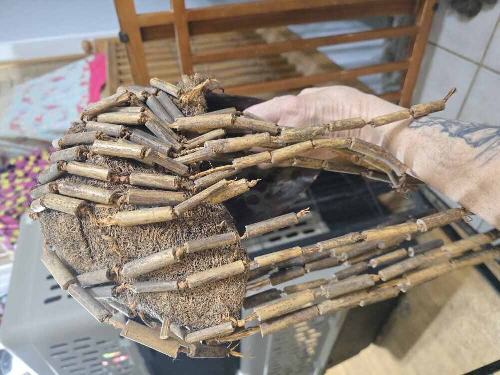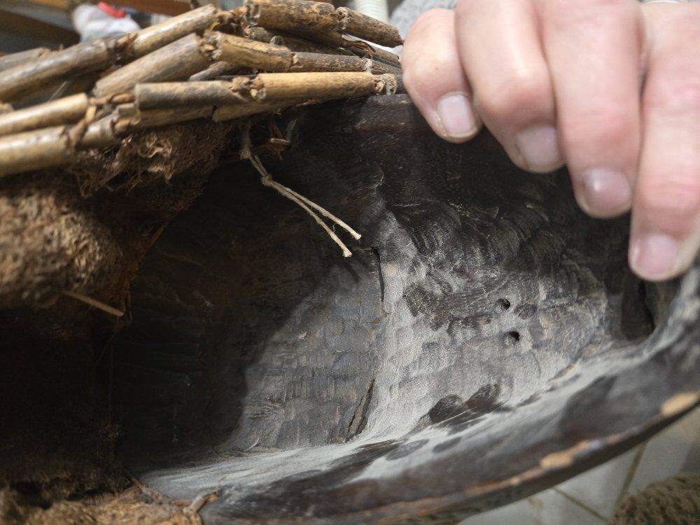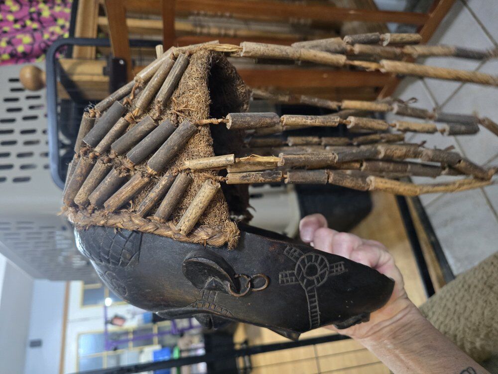 ZelleTribal Style: Describe it as Chokwe-style (from the DRC/Angola region). These masks typically represent the "Mwana Pwo" (young woman), symbolizing a female ancestor who died young. [2, 18, 23] Scarification Patterns: Mention the intricate linear carvings on the forehead and cheeks, which are traditional beauty marks or ethnic identifiers. [1, 2, 25] Facial Details: Highlight the coffee-bean shaped eyes, high arched forehead, and the detailed mouth showing teeth, which are characteristic of this region's artistry. [1, 2, 18] Material and Accents: Note the dark, polished wood and the woven fiber hair or dreadlocks attached to the sides and back, as well as the metal earrings. [2, 13, 19] Condition: Describe any natural "patina" (the aged look of the wood) and mention if it is a vintage decorative piece or a ceremonial artifact if you have that history. [3, 7, 25]