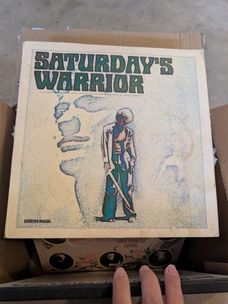 A box of over 45 vintage vinyl records. These are all of the LDS/Christian/Gospel records from my collection.