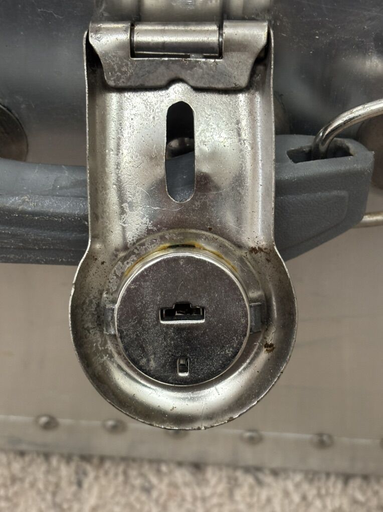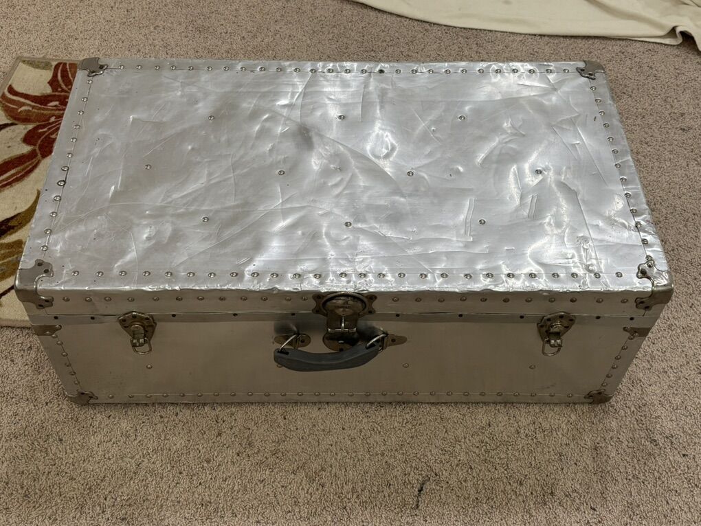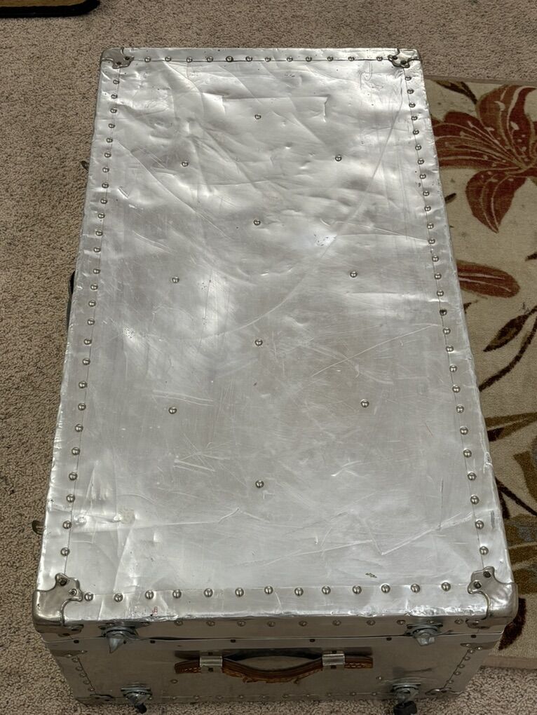 Vintage Aluminium Silver Trunk/Suitcase Coffee Table 36” Rectangle Storage Box Riveted Edge Lock and Latches Dimensions: 36”L X 20.25”D X 13”H No advance payment Payment and pickup up same time.