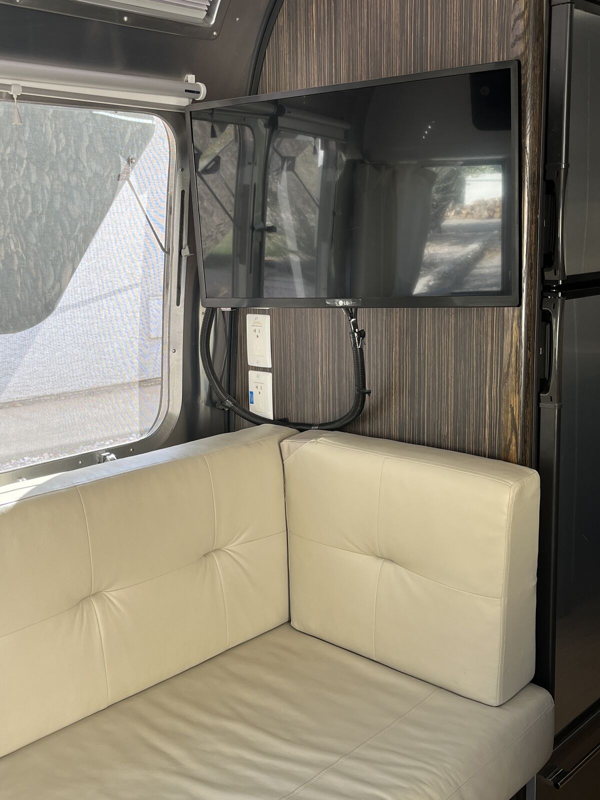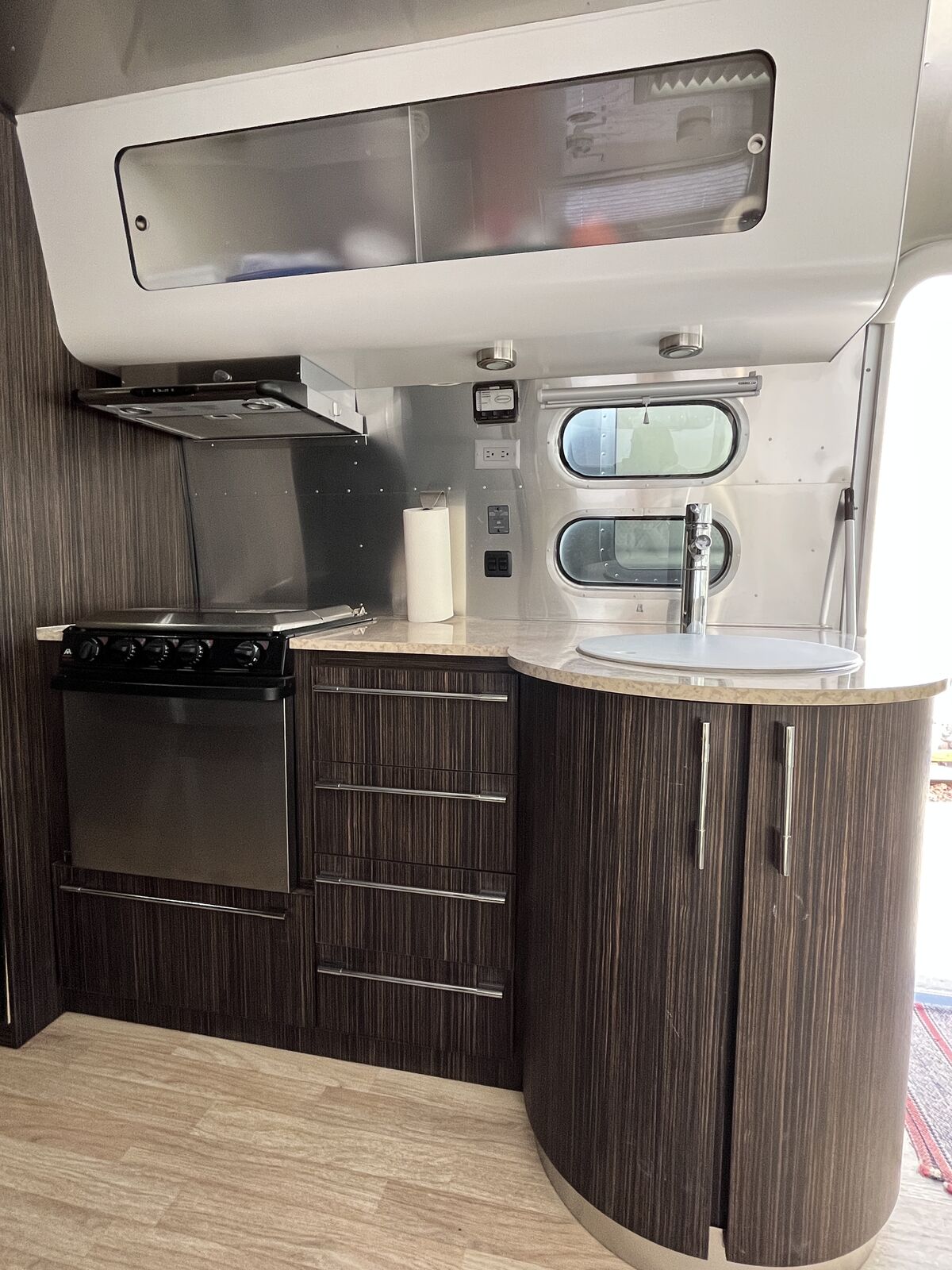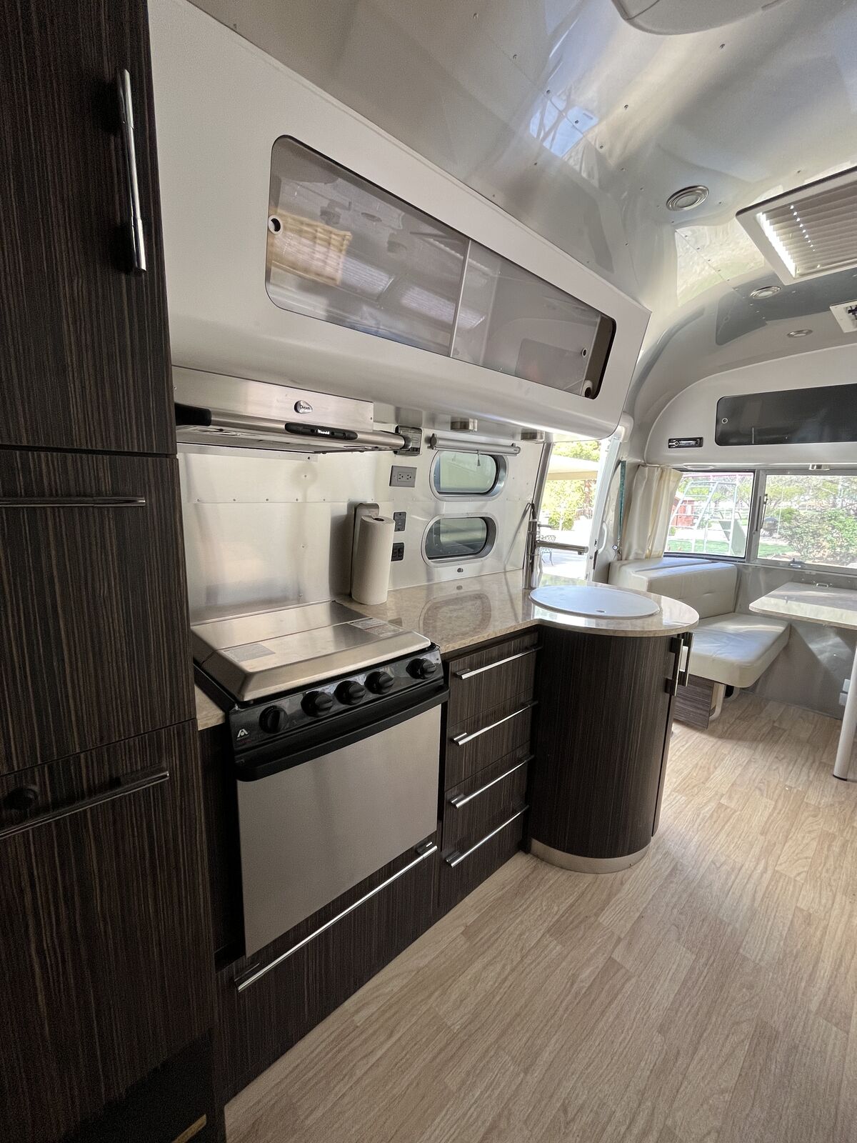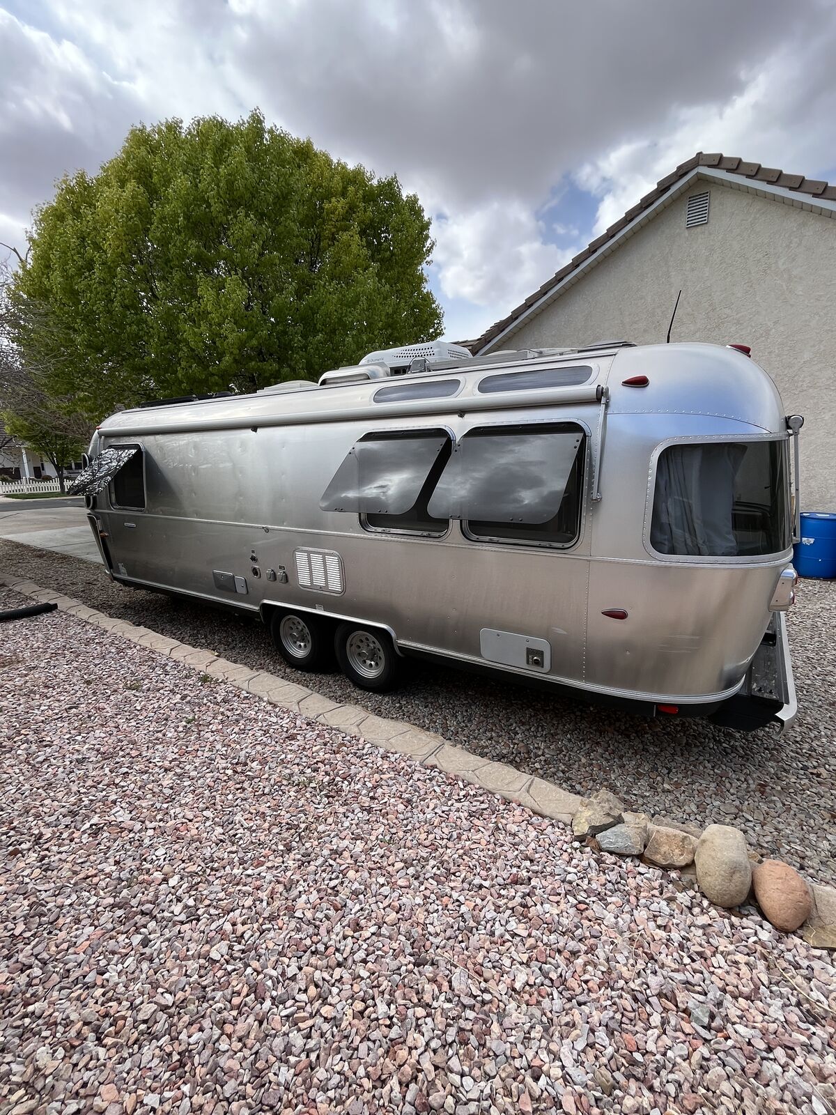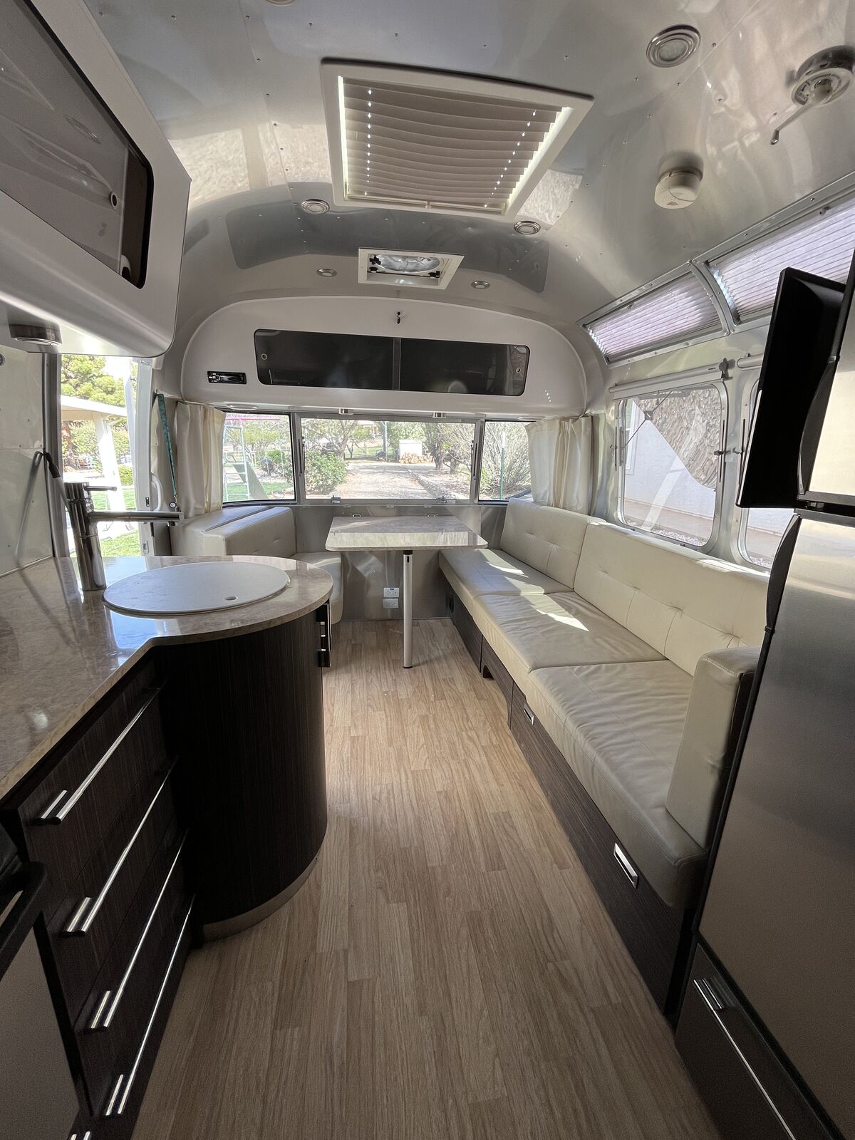 Inside, the Airstream International is designed with comfort and functionality in mind. The living area features plush seating, a dining table, and plenty of storage space. The kitchen is equipped with modern appliances, a sink, and ample counter space for preparing meals on the go. The bathroom includes a shower, toilet, and sink for added convenience. The trailer features AC, microwave, 2 tvs, electric/propane fridge, 3 burner propane stove, outdoor shower, and solar power. There is a scratch on one side of the exterior.