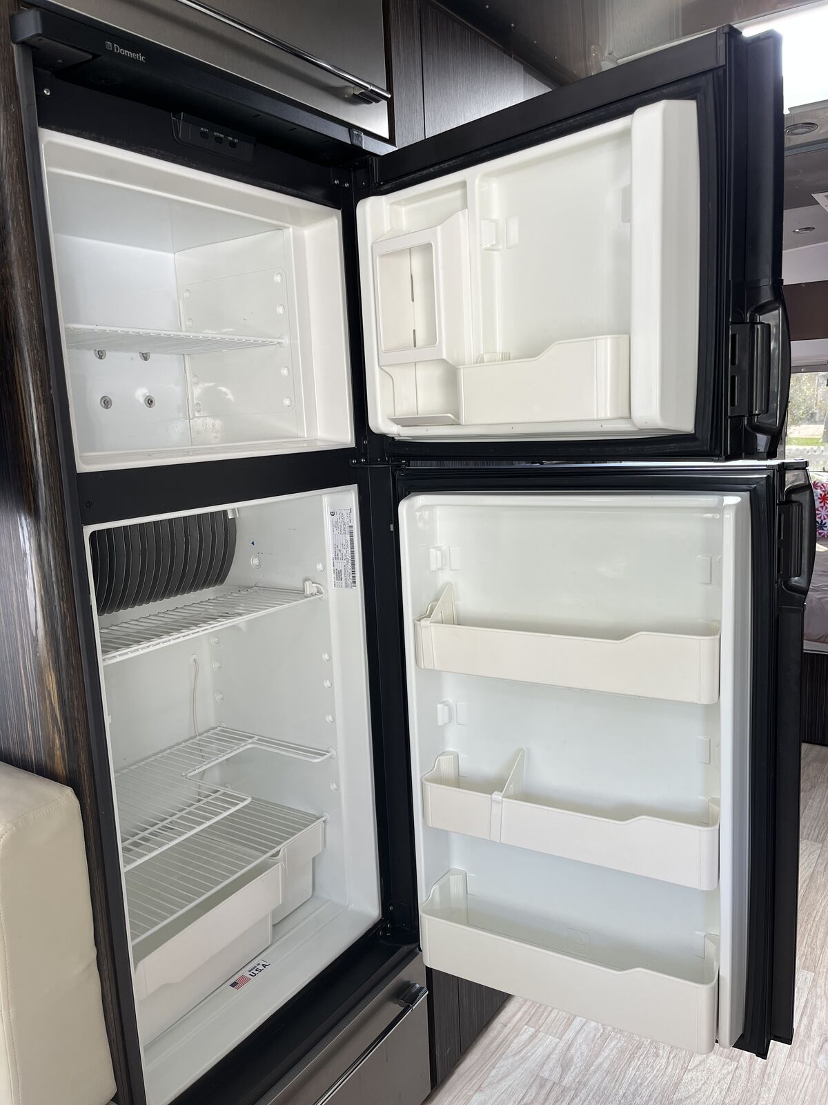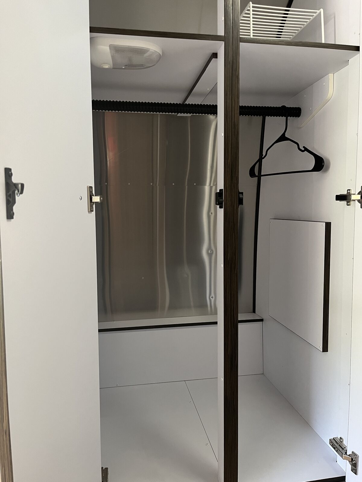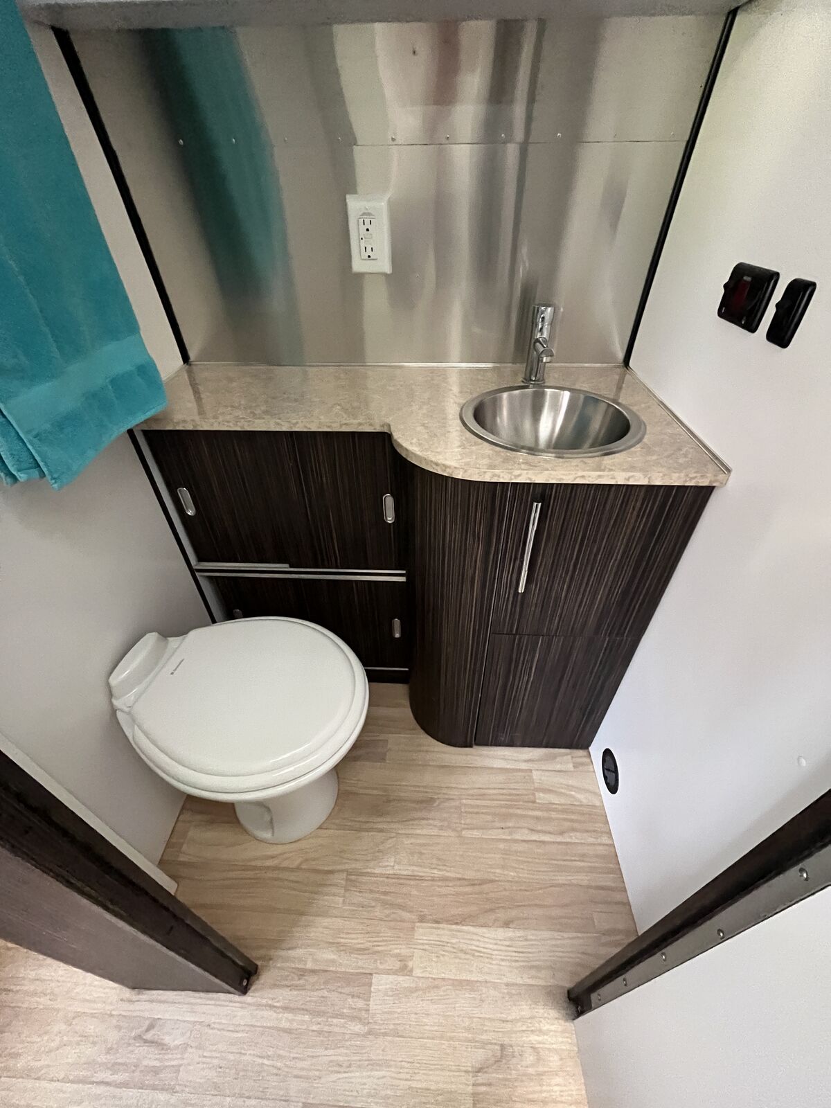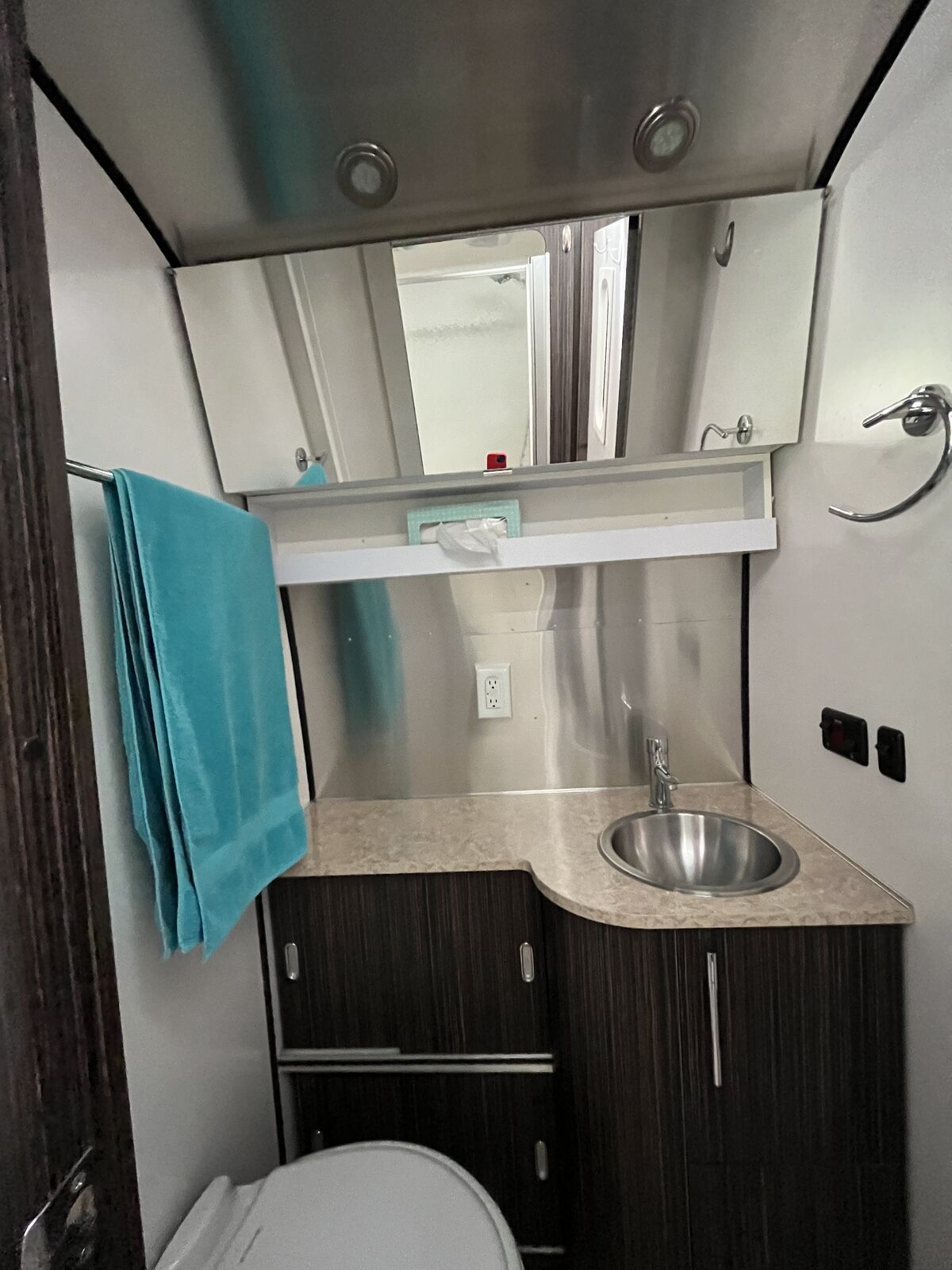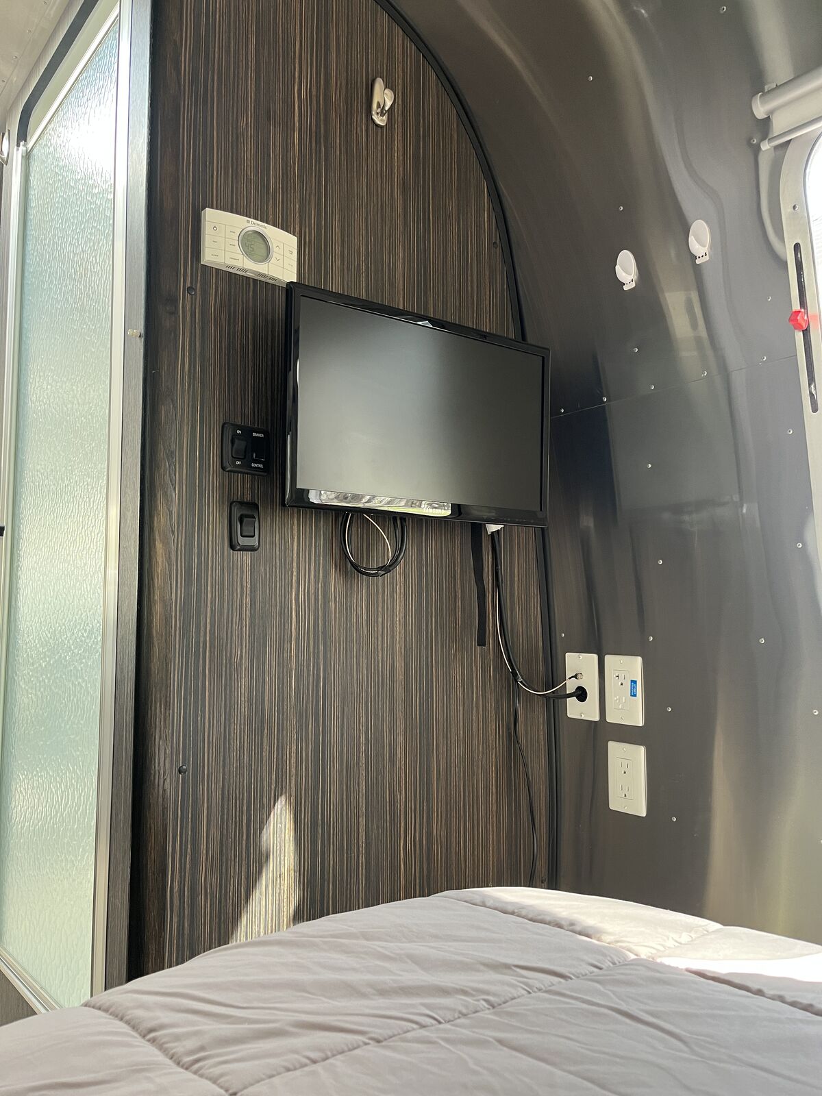 Inside, the Airstream International is designed with comfort and functionality in mind. The living area features plush seating, a dining table, and plenty of storage space. The kitchen is equipped with modern appliances, a sink, and ample counter space for preparing meals on the go. The bathroom includes a shower, toilet, and sink for added convenience. The trailer features AC, microwave, 2 tvs, electric/propane fridge, 3 burner propane stove, outdoor shower, and solar power. There is a scratch on one side of the exterior.