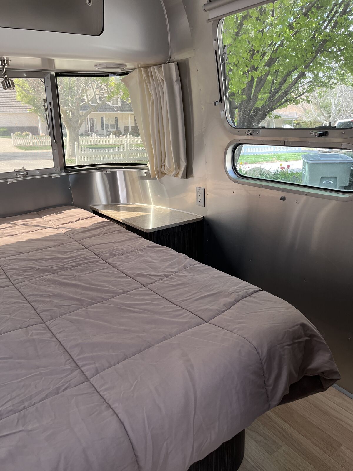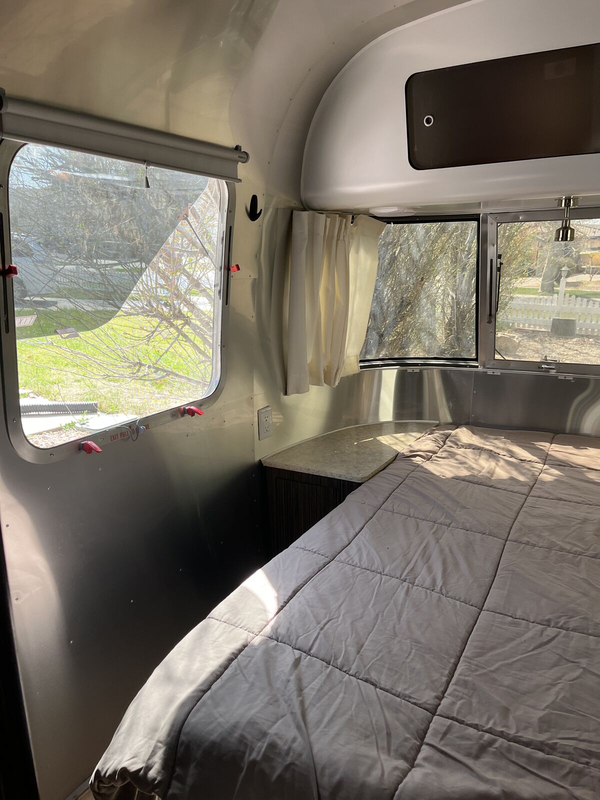 The exterior of the Airstream International features the iconic silver aluminum shell that has made Airstream trailers famous. This model is 28 feet long and can sleep 4.