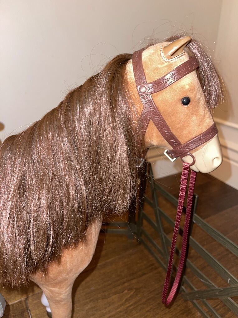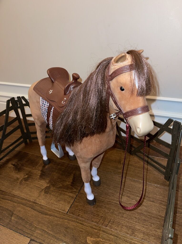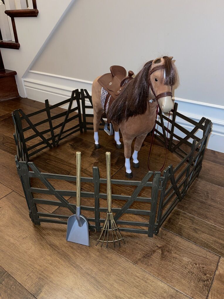 PayPalThis American Girl horse for 18” dolls is in good condition. The blanket underneath the saddle is Battat brand. The fence is American Girl. I’m not sure what brand the two tools are. Fun little horse set up for your 18” dolls!