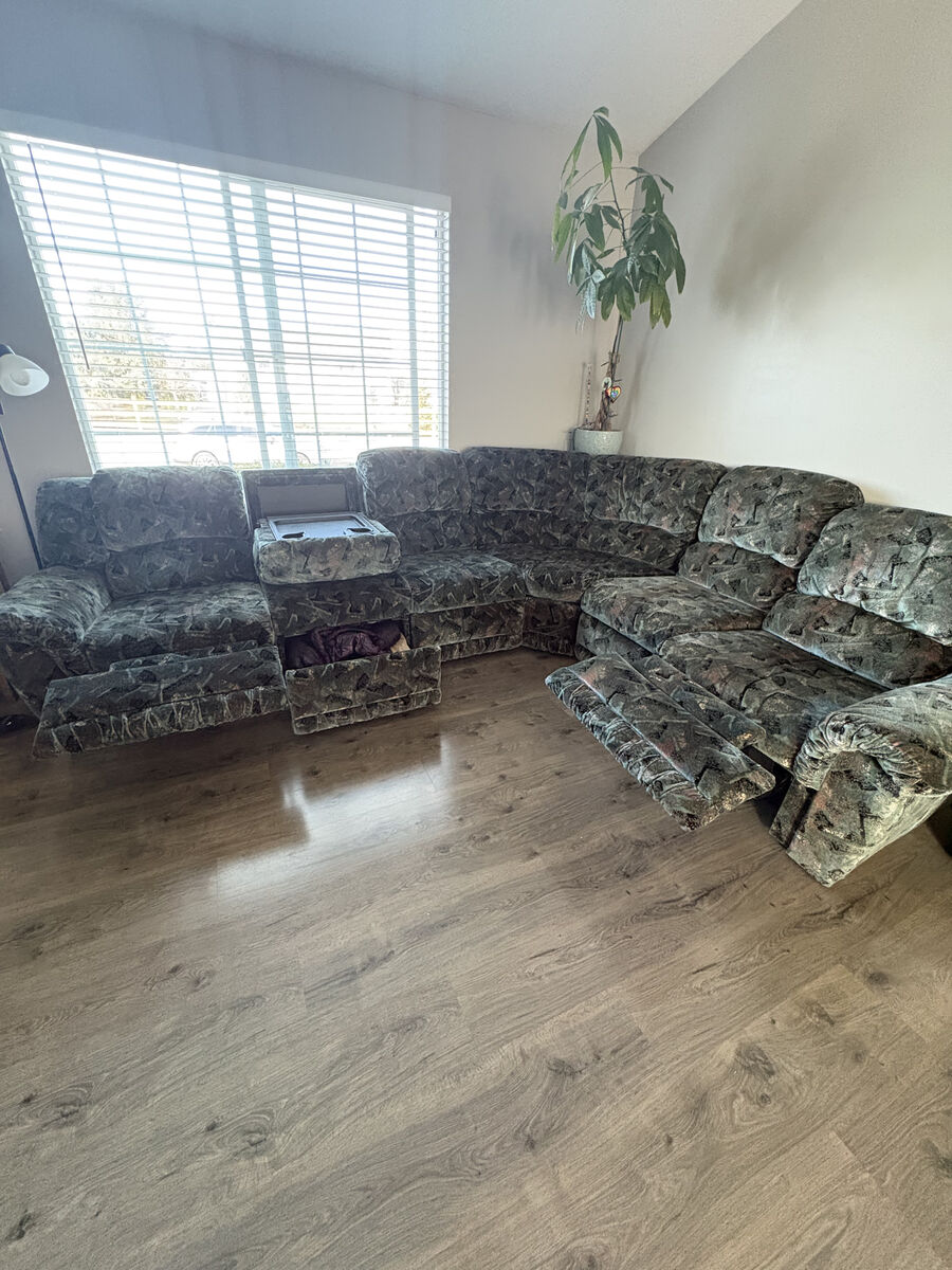 VenmoLarge, La-Z-Boy fabric sectional with two recliners, storage drawer, fold-down drink holder/snack tray area. Approx 10 1/2 feet by 9 1/2 feet. Make an offer.