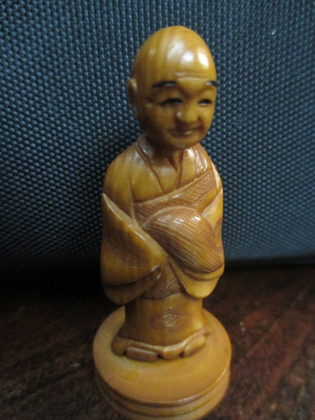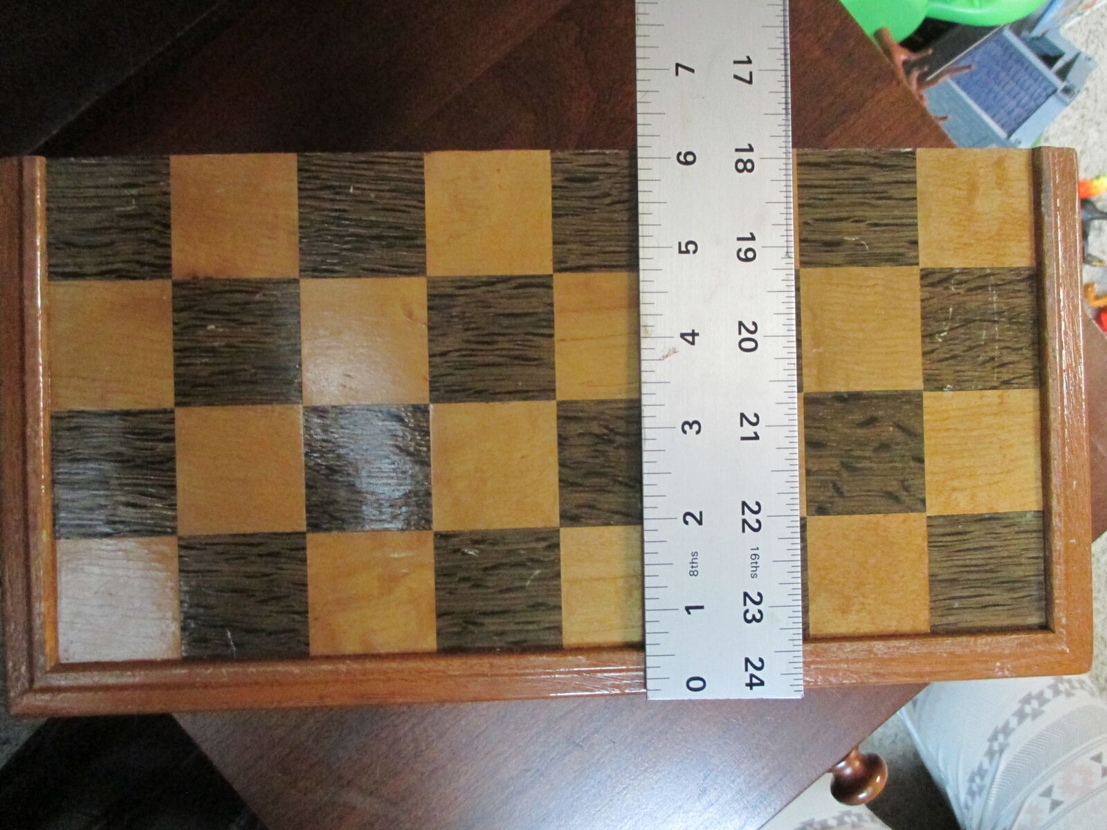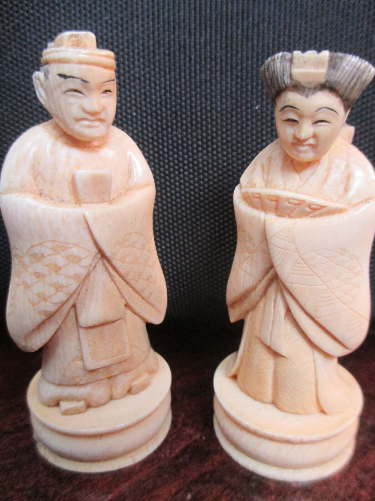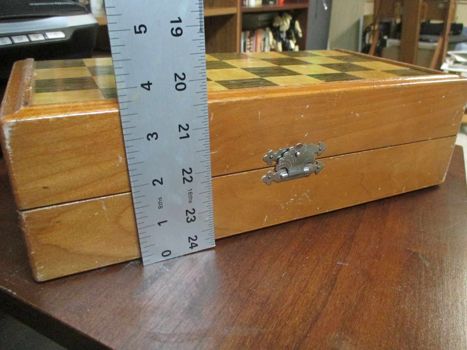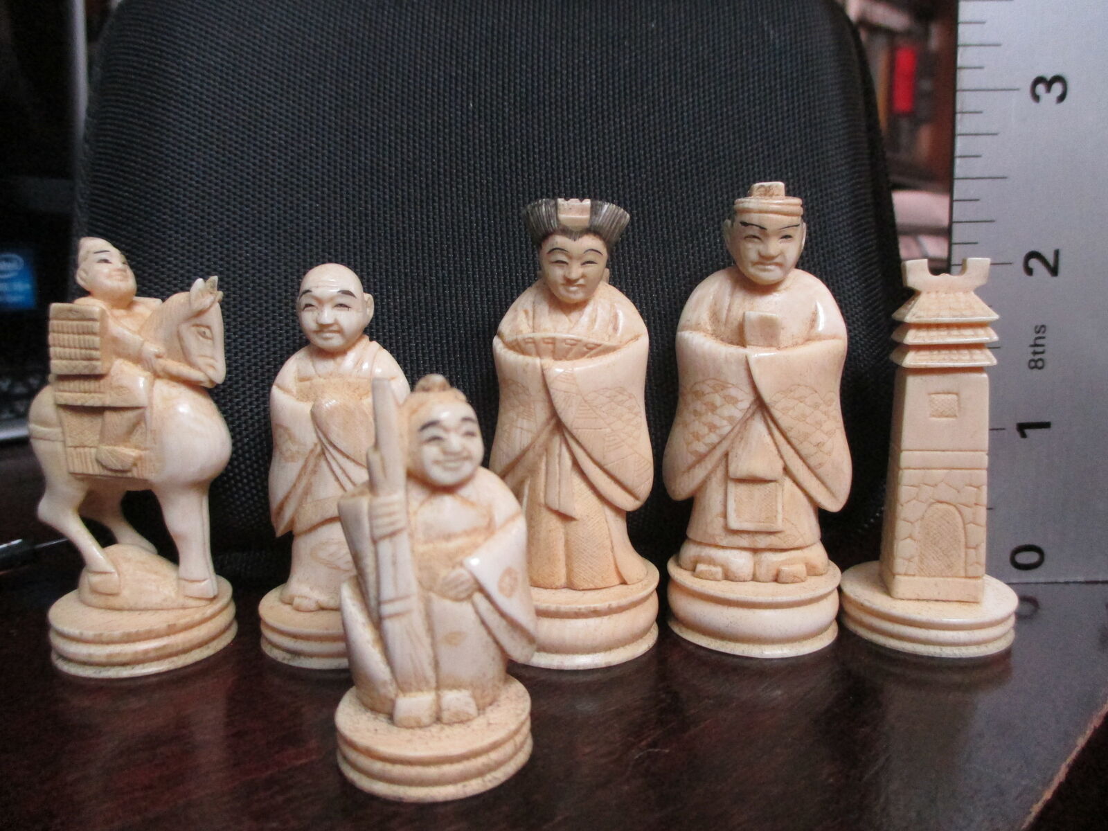 PayPalThis is a handcarved Japanese chess set made in the 1950's. The board is 12" x 12" x 1.75" and the tallest pieces are just over 2". The pieces are intracately carved and very detailed. One of the rooks has a small piece that has broken off (as pictured). The board has some scratches but is in good condition considering its age. It doubles as a case for the pieces which is lined with felt. One of the felt lined dividers has become detached do to wear and the felt becoming fragile in its old age. There is paperwork from the original owners with a brief history of the set.