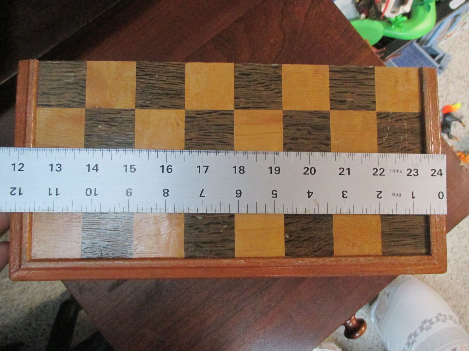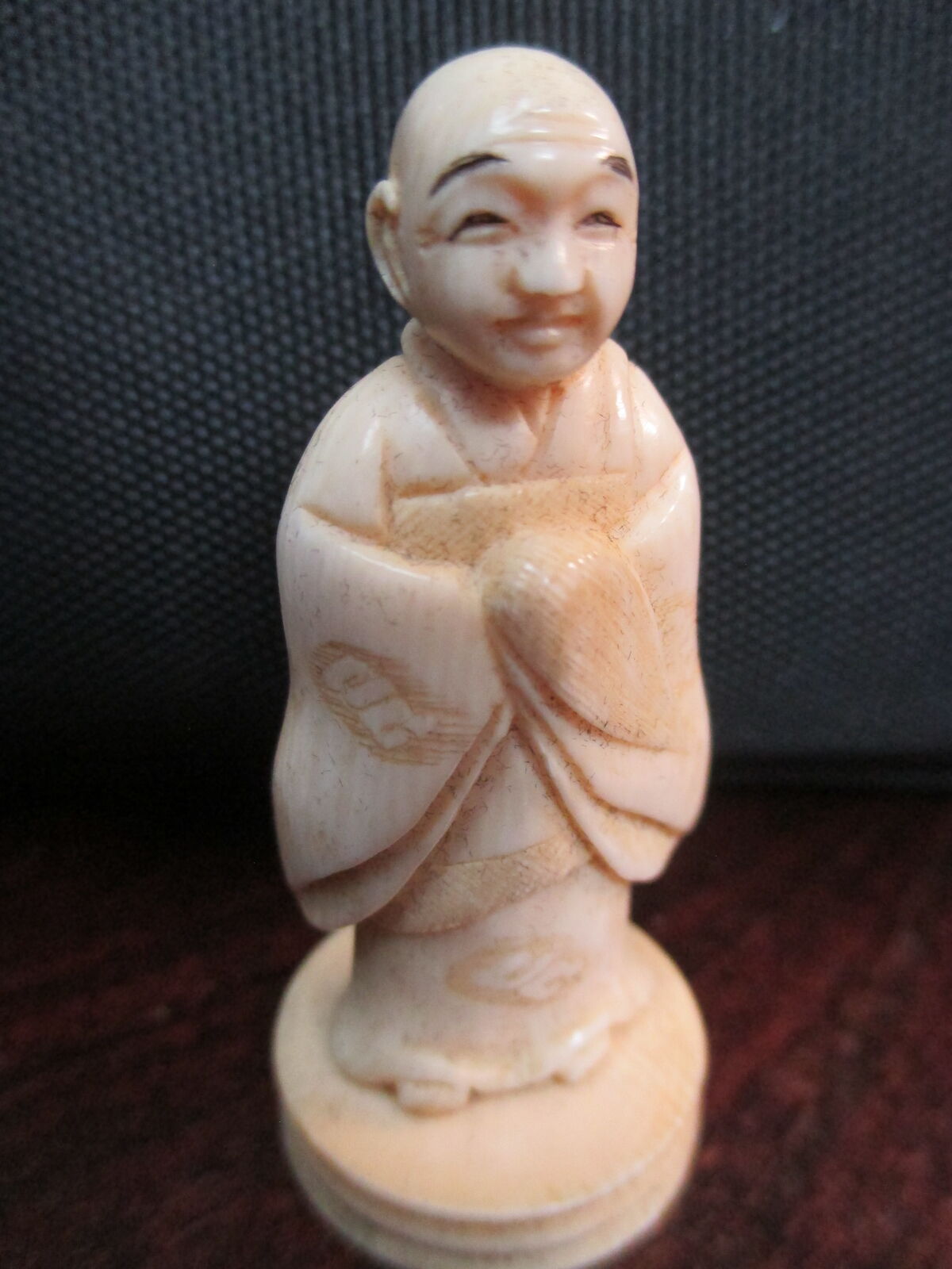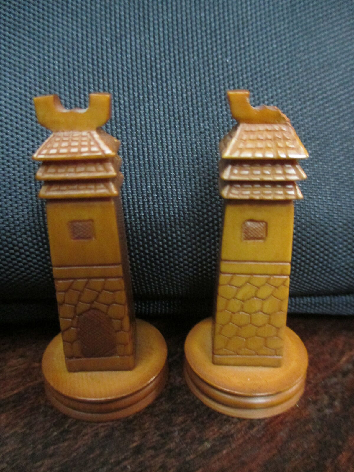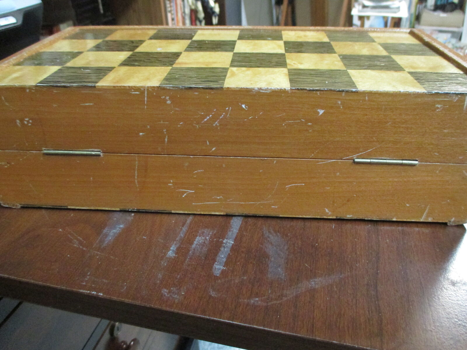 PayPalThis is a handcarved Japanese chess set made in the 1950's. The board is 12" x 12" x 1.75" and the tallest pieces are just over 2". The pieces are intracately carved and very detailed. One of the rooks has a small piece that has broken off (as pictured). The board has some scratches but is in good condition considering its age. It doubles as a case for the pieces which is lined with felt. One of the felt lined dividers has become detached do to wear and the felt becoming fragile in its old age. There is paperwork from the original owners with a brief history of the set.